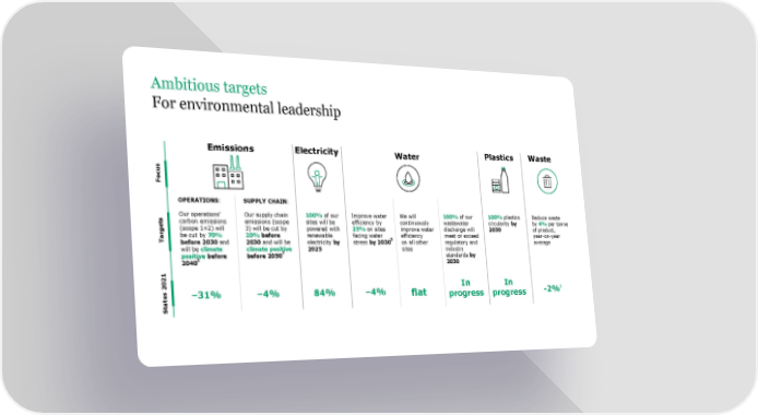 Ambitious targets For environmental leadership Emissions Electricity Water Plastics Waste s u oc F OPERATIONS: SUPPLY CHAIN: s Our operations' Our supply chain 100% of our Improve water We will 100% of our 100% plastics Reduce waste t carbon emissions emissions (scope sites will be efficiency by continuously wastewater circularity by by 4% per tonne e (scope 1+2) will 3) will be cut by powered with 25% on sites improve water discharge will 2030 of product, g be cut by 70% 20%before renewable facing water efficiency meet or exceed year-on-year ar 3 T before 2030 and 2030 and will be electricity by stress by 2030 on all other regulatory and average will be climate climate positive 2025 sites industry 2 standards by positive before before 2050 2 2030 2040 2021 In In 1 s –31% –4% 84% –4% flat progress progress -2% tu ta S