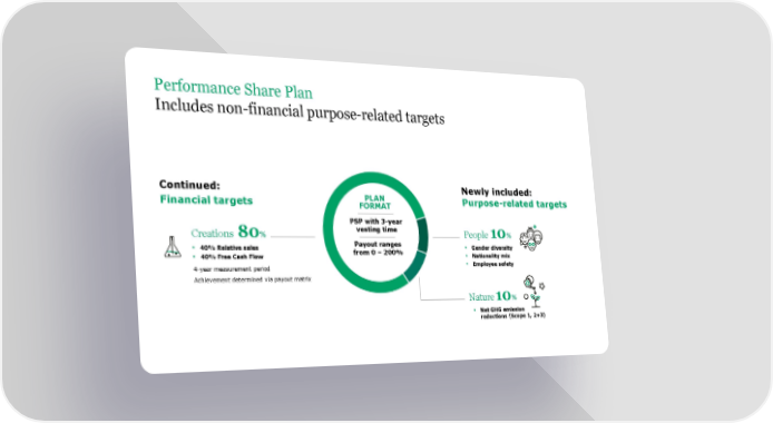 Performance Share Plan Includes non-financial purpose-related targets Continued: Newlyincluded: Financial targets PLAN Purpose-related targets FORMAT PSP with 3-year Creations 80% vesting time People 10% • 40% Relative sales Payout ranges • Gender diversity • 40% Free Cash Flow from 0 – 200% • Nationality mix 4-year measurement period • Employee safety Achievement determined via payout matrix Nature10% • Net GHG emission reductions (Scope 1, 2+3)