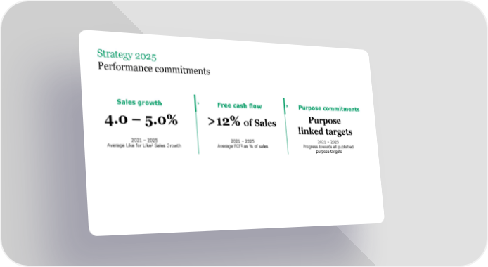 Strategy 2025 Performance commitments Sales growth Free cash flow Purpose commitments 4.0 –5.0% >12% of Sales Purpose linked targets 2021 – 2025 2021 – 2025 2021 – 2025 1 2 Average Like for Like Sales Growth Average FCF as % of sales Progress towards all published purpose targets
