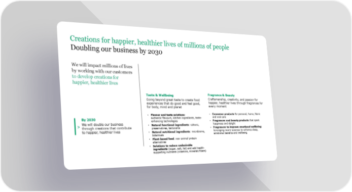 Creations for happier, healthier lives of millions of people Doubling our business by 2030 We will impact millions of lives by working with our customers to develop creations for happier, healthier lives Taste & Wellbeing Fragrance & Beauty Going beyond great taste to create food Craftsmanship, creativity, and passion for experiences that do good and feel good, happier, healthier lives through fragrances for for body, mind and planet every moment • Flavour and taste solutions: • Consumer products for personal, home, fabric By 2030 authentic flavours, kitchen ingredients, taste- and oral care enhancing technologies • Fragrances and beauty products that spark > We will double our business • Natural functional ingredients: colours, happiness and delight through creations that contribute preservatives, texturants • Fragrances to improve emotional wellbeing: to happier, healthier lives • Natural nutritional ingredients: microbiome, leveraging neuro-sciences to enhance sleep, botanicals emotional benefits and wellbeing • Plant-based food: non-animal protein alternatives • Solutions to reduce undesirable ingredients (sugar, salt, fat) and add health- supporting nutrients (vitamins, minerals fibers)