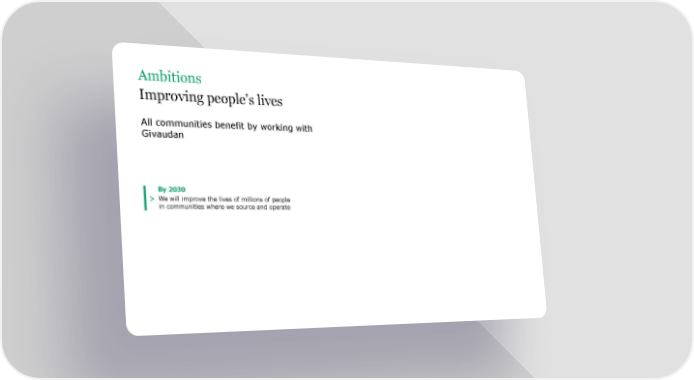 Ambitions Improving people’s lives All communities benefit by working with Givaudan By 2030 > We will improve the lives of millions of people in communities where we source and operate