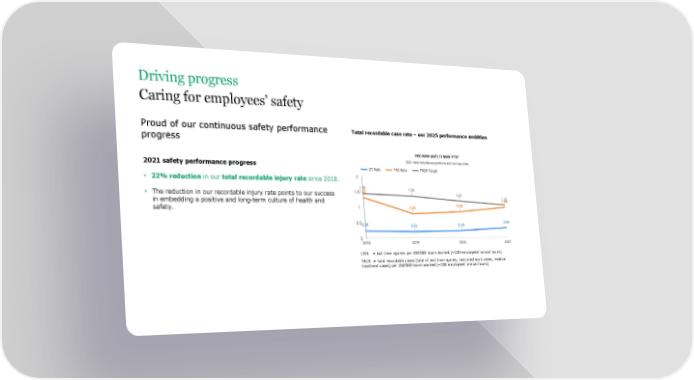 Driving progress Caring for employees’ safety Proud of our continuous safety performance Total recordable case rate – our 2025 performance ambition progress 2021 safety performance progress • 22% reduction in our total recordable injury rate since 2018. • The reduction in our recordable injury rate points to our success in embedding a positive and long-term culture of health and safety. LTIR = lost-time injuries per 200’000 hours worked (~100 employees’ annual hours) TRCR = total recordable cases (total of lost time injuries, restricted work cases, medical treatment cases) per 200’000 hours worked (~100 employees’ annual hours)