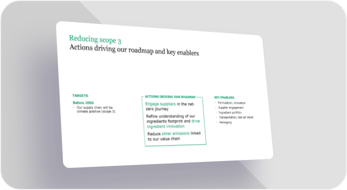 Reducing scope 3 Actions driving our roadmap and key enablers TARGETS ACTIONS DRIVING OUR ROADMAP KEY ENABLERS Before 2050 Engage suppliers in the net- • Formulation, innovation • Our supply chain will be zero journey • Supplier engagement climate positive (scope 3) • Ingredient portfolio Refine understanding of our • Transportation, less air travel ingredients footprint and drive • Packaging ingredient innovation Reduce other emissions linked to our value chain