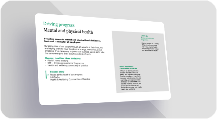 Driving progress Mental and physical health LifeWorks Employee Assistance Programme Providing access to mental and physical heath initiatives, Offering support on a variety tools and training for all employees of topics such as personal well-being, mental health, By taking care of our people through all aspects of their lives, we relationships, family matters are helping them to have the physical energy, mental focus and and workplace challenges. emotional drive necessary to power our business as well as to take the same energy to their activities outside of work. Happier, Healthier Lives initiatives • Health, home working • EAP – Employee Assistance Programme • Health and wellbeing community of practice Health & Wellbeing Communities of Practice Success story A forum for sharing common People at the heart of our progress: interest and best practice in > health and wellbeing initiatives. LifeWorks Involved employees from North Health & Wellbeing Communities of Practice America, Latin America, the UK and Dubai, and topics included strategies for better sleep, the benefits of family activities, and a variety of local initiatives focusing on physical and mental health and wellbeing.
