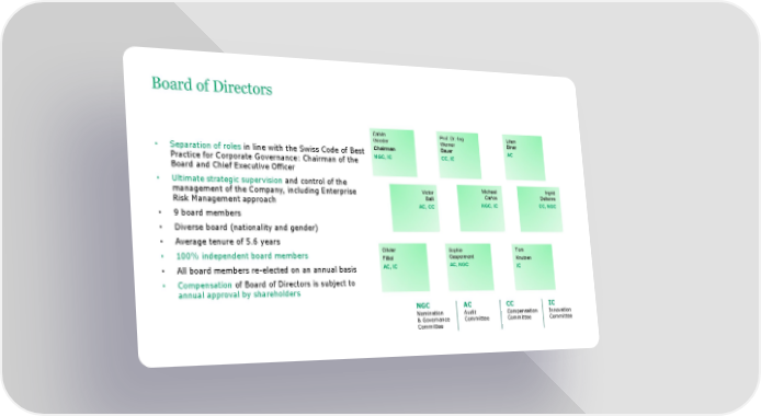 Board of Directors Calvin Prof. Dr.-Ing Lilian Grieder Werner Biner • Separation of roles in line with the Swiss Code of Best Chairman Bauer AC Practice for Corporate Governance: Chairman of the NGC, IC CC, IC Board and Chief Executive Officer • Ultimate strategic supervision and control of the management of the Company, including Enterprise Victor Michael Ingrid Risk Management approach Balli Carlos Deltenre AC, CC NGC, IC CC, NGC • 9 board members • Diverse board (nationality and gender) • Average tenure of 5.6 years • 100% independent board members Olivier Sophie Tom Filliol Gasperment Knutzen • All board members re-elected on an annual basis AC, IC AC, NGC IC rd of Directors is subject to • Compensation of Boa annual approval by shareholders NGC AC CC IC Nomination Audit Compensation Innovation & Governance Committee Committee Committee Committee
