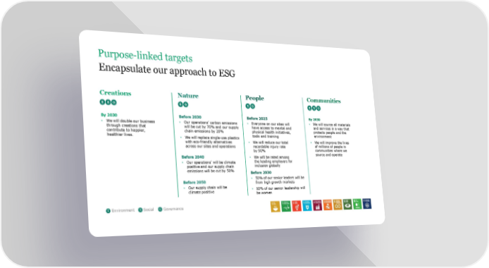 Purpose-linked targets Encapsulate our approach to ESG Creations Nature People Communities E S G E G S G E S G By 2030 Before 2030 Before 2025 By 2030 • We will double our business • Our operations’ carbon emissions • Everyone on our sites will • We will source all materials through creations that will be cut by 70% and our supply have access to mental and and services in a way that contribute to happier, chain emissions by 20% physical health initiatives, protects people and the healthier lives. • We will replace single-use plastics tools and training environment with eco-friendly alternatives • We will reduce our total • We will improve the lives across our sites and operations recordable injury rate of millions of people in by 50% communities where we Before 2040 • We will be rated among source and operate • Our operations’ will be climate the leading employers for positive and our supply chain inclusion globally emissions will be cut by 50% Before 2030 Before 2050 • 50% of our senior leaders will be from high growth markets • Our supply chain will be • 50% of our senior leadership will climate positive be women E Environment S Social G Governance