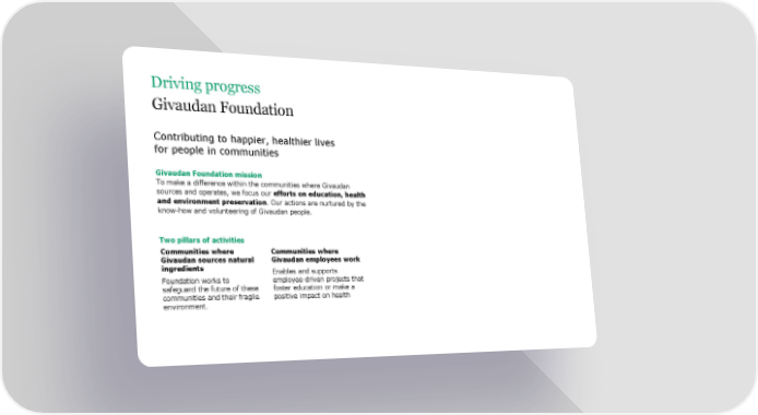 Driving progress Givaudan Foundation Contributing to happier, healthier lives for people in communities Givaudan Foundation mission To make a difference within the communities where Givaudan sources and operates, we focus our efforts on education, health and environment preservation. Our actions are nurtured by the know-how and volunteering of Givaudan people. Two pillars of activities Communities where Communities where Givaudan sources natural Givaudan employees work ingredients Enables and supports Foundation works to employee-driven projects that safeguard the future of these foster education or make a communities and their fragile positive impact on health environment.