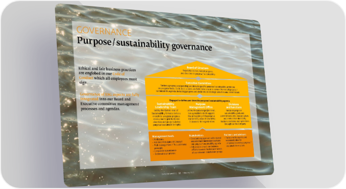 GOVERNANCE Purpose / sustainability governance Board of Directors Ethical and fair business practices Regularly reviews overall progress are englobed in our Code of and direction in purpose / sustainability Conduct which all employees must Executive Committee sign. Reviews progress and pending decisions in specific purpose / sustainability ambitions on a regular basis. Dedicated sessions are held twice a year to review the overall purpose / sustainability agenda, including progress and decisions on strategic direction and commitment Governance of ESG aspects are fully integrated into our Board and Engaged to define and drive the purpose / sustainability agenda Executive committee management Sustainability Purpose Divisions processes and agendas. Leadership Team Management Office and functions Led by the Global Head of Led by the purpose project lead. Integrate purpose / Sustainability, it meets twice a Is responsible to both support sustainability goals and month for a regular progress the embedding of the purpose commitments into strategic plans review and to jointly discuss and identify ways of cascading and embed them into daily direction and progress in key it down to the organization business decisions and operations purpose / sustainability topics throughout the Company Management tools Stakeholders Partners and advisors • Ambitions • Constant engagement with internal • Partner with experts and • Policies / Principles of Conduct and external stakeholders nurtures external bodies for • Risk management / Precautionary our purpose / sustainability agenda collaboration on key purpose / principle • Allow us to direct our business sustainability matters • Corporate Governance efforts towards the broader needs • External assessments of our relevant stakeholder groups Givaudan and ESG 12 February 2022