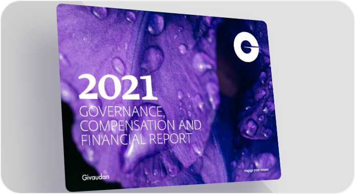 Our reporting suite The 2021 Integrated Annual Report offers a holistic explanation of our value creation, financial and non-financial capitals and performance. The full Governance, Compensation and Financial reports are available in one separate PDF. The GRI Sustainability Report features disclosures on a wide range of topics such as energy use, diversity in the workplace, anti-corruption and human rights. Our website hosts the online Integrated Annual Report. Readers are advised to consult our entire reporting suite to get a complete overview. The full suite can be found on: www.givaudan.com ▸ Investors ▸ Online annual report ▸ Download centre 2021 Integrated Annual Report Available in English PDF from 28 January 2022 Print from 24 March 2022 Online version Available in English from 28 January 2022 2021 Governance, Compensation and Financial Report Available in English PDF from 28 January 2022 2021 In a Nutshell Available in English, French and German PDF in English from 28 January 2022 Print and language versions from 24 March 2022 2021 GRI Sustainability Report Available in English PDF from 28 January 2022 READ MORE ▸ GRI Content Index ▸ SASB Table ▸ TCFD Table 126 Givaudan — 2021 Governance, Compensation and Financial Report Governance Report Compensation Report Consolidated Financial Report Statutory Financial Report Appendix