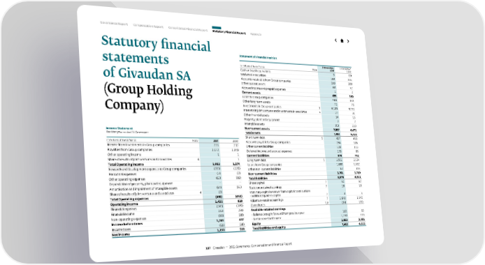 Statutory financial statements of Givaudan SA (Group Holding Compa ny) Statement of Financial Position in millions of Swiss francs Note 31 December 2021 31 December 2020 Cash and cash equivalents 9 10 Marketable securities 188 106 Accounts receivable from Group companies 169 180 Other current assets 68 52 Accrued income and prepaid expenses 1 2 Current assets 435 350 Loans to Group companies 400 150 Other long-term assets 72 75 Investments in Group companies 3 6,189 5,991 Interests in joint ventures and investments in associates 4 27 31 Other financial assets 14 13 Property, plant and equipment 2 2 Intangible assets 353 210 Non-current assets 7, 0 5 7 6,472 Total assets 7,492 6,822 Short-term debt 5 437 468 Accounts payable to Group companies 156 106 Other current liabilities 130 133 Deferred income and accrued expenses 155 85 Current liabilities 878 792 Long-term debt 5 2,551 2,524 Loans from Group companies 1,088 1,092 Other non-current liabilities 62 103 Non-current liabilities 3,701 3,719 Total liabilities 4,579 4,511 Share capital 7 92 92 Statutory retained earnings 7 18 18 Statutory capital reserves from capital contributions - additional paid-in capital 7 3 3 Voluntary retained earnings 7 1,542 1,542 Own shares 7, 8 (34) (35) Available retained earnings - Balance brought forward from previous year 102 92 - Net income for the year 1,190 599 Equity 2,913 2,311 Total liabilities and equity 7,492 6,822 Income Statement For the year ended 31 December in millions of Swiss francs Note 2021 2020 Income from investments in Group companies 739 232 Royalties from Group companies 1,172 1,040 Other operating income 1 1 Share of results of joint ventures and associates 4 1 Total Operating income 1,912 1 , 274 Research and development expenses to Group companies (359) (325) Personnel expenses (2) (2) Other operating expenses (62) (66) Depreciation of property, plant and equipment – – Amortisation and impairment of intangible assets (64) (61) Share of results of joint ventures and associates 4 (3) Total Operating expenses (490) (454) Operating income 1,422 820 Financial expenses (249) (385) Financial income 158 290 Non-operating expenses (90) (88) Income before taxes 1,241 637 Income taxes (51) (38) Net income 1,190 599 107 Givaudan — 2021 Governance, Compensation and Financial Report Governance Report Compensation Report Consolidated Financial Report Statutory Financial Report Appendix