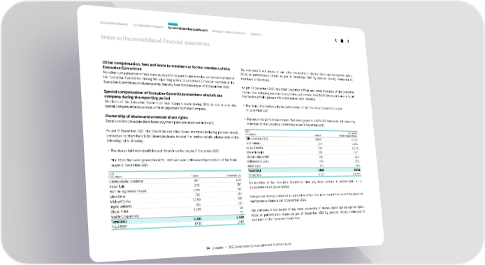 Other compensation, fees and loans to members or former members of the Executive Committee No other compensation or fees were accrued for or paid to any member or former member of the Executive Committee during the reporting period. No member or former member of the Executive Committee or related parties had any loan outstanding as of 31 December 2021. Special compensation of Executive Committee members who left the company during the reporting period Members of the Executive Committee that stepped down during 2021 did not receive any special compensation as a result of their departure from the Company. Ownership of shares and unvested share rights Details on the Givaudan share based payment plans are described in Note 9. As per 31 December 2021, the Chairman and other Board members including persons closely connected to them held 6,183 Givaudan shares in total. For further details, please refer to the following table showing: – The shares held individually by each Board member as per 31 December 2021. – The RSUs that were granted in 2019 – 2021 and were still owned by members of the Board as per 31 December 2021. 2021 in numbers Shares Blocked RSUs Calvin Grieder, Chairman 947 629 Victor Balli 248 157 Prof. Dr-Ing. Werner Bauer 1,428 157 Lilian Biner 735 157 Michael Carlos 1,260 157 Ingrid Deltenre 365 157 Olivier Filliol 1,200 94 Sophie Gasperment 72 Total 2021 6,183 1,580 Total 2020 6,501 1,962 The company is not aware of any other ownership of shares, share options/option rights, RSUs or performance shares as per 31 December 2021 by persons closely connected to members of the Board. As per 31 December 2021, the Chief Executive Officer and other members of the Executive Committee, including persons closely connected to them, held 8,053 Givaudan shares in total. For further details, please refer to the below table showing: – The shares held individually by each member of the Executive Committee as per 31 December 2021. – The unvested performance shares that were granted in 2019–2021 and were still owned by members of the Executive Committee as per 31 December 2021. 2021 in numbers Shares Unvested Performance Shares Gilles Andrier, CEO 4,600 2,715 Tom Hallam 278 1,141 Louie D'Amico 525 1,270 Maurizio Volpi 801 1,357 Simon Halle-Smith 706 815 Willem Mutsaerts 434 815 A nn e Tay ac 525 815 Total 2021 7, 8 6 9 8,928 Total 2020 6,312 10,937 No member of the Executive Committee held any share options or option rights as at 31 December 2021 (2020: none). One person closely connected to a member of the Executive Committee owned 184 unvested Performance Shares as at 31 December 2021. The company is not aware of any other ownership of shares, share options/option rights, RSUs or performance shares as per 31 December 2021 by persons closely connected to members of the Executive Committee. Governance Report Compensation Report Consolidated Financial Report Statutory Financial Report Appendix 94 Givaudan — 2021 Governance, Compensation and Financial Report Notes to the consolidated financial statements