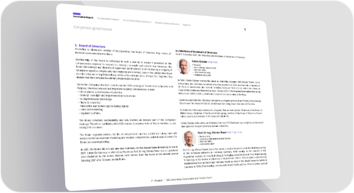 3. Board of Directors According to Givaudan’s Articles of Incorporation, the Board of Directors may consist of between seven and nine members. Membership of the Board is composed in such a way as to ensure it possesses all the competencies required to execute its strategic oversight and control over Givaudan. The Board’s knowledge and diversity of experience are important assets in leading a company of Givaudan’s size in a complex and fast-changing environment. Each of the current nine Board members has an in-depth knowledge of his or her relevant areas of expertise. Together, they ensure that the Company has all the competencies required. Given the Company’s business and its current 2025 strategy of ‘Committed to Growth, with Purpose’, the most relevant and important required competencies include: – international senior business leadership – Strategic oversight and implementation track record – in-depth industry knowledge – financial expertise – innovation and technology (including digital) – sales and marketing – regulatory affairs. The Board considers sustainability and ESG matters an integral part of the Company‘s strategy. Therefore, familiarity with ESG matters is required from all Board members, as are strong ethical values. The Board regularly reviews the list of competencies and has established a long-term skill matrix for the assessment of existing and required competencies, which is used as a basis for Board succession planning. In 2021, the Board did not add any new members. At the Annual General Meeting in March 2021, Calvin Grieder was re-elected as Chairman. Prof. Dr-Ing Werner Bauer was re-appointed Vice-Chairman by the Board. Thomas Rufer retired from the Board at the Annual General Meeting 2021 after 12 years on the Board. 3.1 Members of the Board of Directors As of 31 December 2021, the following were members of the Board of Directors: Calvin Grieder Chairman • Engineer • Swiss national, born in 1955 • Non-executive • First elected in 2014 • Chairman since 2017 In 1980, Calvin Grieder started his career as Marketing Manager with Georg Fischer Ltd in Switzerland and continued in various executive positions at Swiss and German companies in the field of automation and control, including Swisscom Telecom Ltd, where he served as Head of the Mobile and Internet business. He was CEO of the international engineering group Bühler from 2001 to 2016, a worldwide leader in food processing technology. Calvin Grieder holds the following mandate in a company quoted on an official stock exchange: Chairman of the Board of SGS SA, world leader in testing, inspection and certification. He holds the following mandates in companies that are non-quoted: Chairman of the Board of Bühler Group, Chairman of the Board of AWK group, member of the Board of Trustees of Avenir Suisse, owner and member of the Board of Carivel7 AG. Calvin Grieder holds a Master of Science from the ETH Zurich and has completed an Advanced Management Program (AMP) at Harvard University. Prof. Dr-Ing. Werner Bauer Vice-Chairman • Businessman • German & Swiss national, born in 1950 • Non-executive • First elected 2014 Prof. Dr-Ing. Werner Bauer started his career as a university professor in chemical engineering at the Technical University in Hamburg, Germany. After serving as the Director of the Fraunhofer Institute for Food Technology & Packaging and as Professor in Food Bioprocessing Technology at the Technical University of Munich from 1985 to 1990, he joined world leading multinational food and beverage company Nestlé as Head of the Nestlé Research Centre in Lausanne in 1990. After heading commercially Nestlé South and East Africa he joined general Corporate governance Governance Report Compensation Report Consolidated Financial Report Statutory Financial Report Appendix 7 Givaudan — 2021 Governance, Compensation and Financial Report