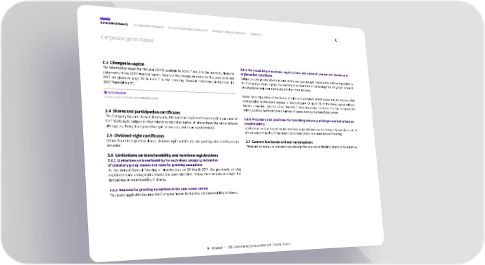 2.3 Changes in capital The information regarding the year 2019 is available in notes 7 and 8 to the statutory financial statements of the 2019 Financial report. Details of the changes in equity for the years 2020 and 2021 are given on page 110 in note 7 to the statutory financial statements included in the 2021 Financial report. DOWNLOAD www.givaudan.com ▸ Investors ▸ Results centre 2.4 Shares and participation certificates The Company has one class of shares only. All shares are registered shares with a par value of CHF 10.00 each. Subject to the limitations described below, all shares have the same rights in all respects. Every share gives the right to one vote and to an equal dividend. 2.5 Dividend-right certificates Other than the registered shares, dividend-right certificates and participation certificates do not exist. 2.6 Limitations on transferability and nominee registrations 2.6.1 Limitations on transferability for each share category; indication of statutory group clauses and rules for granting exceptions At the Annual General Meeting of shareholders on 20 March 2014, the previously existing registration and voting rights restrictions were abolished. Today, the Company no longer has limitations on transferability of shares. 2.6.2 Reasons for granting exceptions in the year under review This is not applicable because the Company has no limitations on transferability of shares. 2.6.3 Permissibility of nominee registrations; indication of any percent clauses and registration conditions Subject to the provisions mentioned in the next paragraph, registration with voting rights in the Company’s share register is conditional on shareholders declaring that they have acquired the shares in their own name and for their own account. Based on a regulation of the Board of Directors, nominee shareholders may be entered with voting rights in the share register of the Company for up to 2% of the share capital without further condition, and for more than 2% if they undertake to disclose to the Company the name, address, nationality and number of shares held by the beneficial owners. 2.6.4 Procedure and conditions for cancelling statutory privileges and limitations on transferability Limitations on transferability and nominee registrations may be changed by a positive vote of the absolute majority of the share votes represented at a shareholders’ meeting. 2.7 Convertible bonds and warrants/options There are no bonds or warrants outstanding that are convertible into shares of Givaudan SA. Corporate governance Governance Report Compensation Report Consolidated Financial Report Statutory Financial Report Appendix 6 Givaudan — 2021 Governance, Compensation and Financial Report