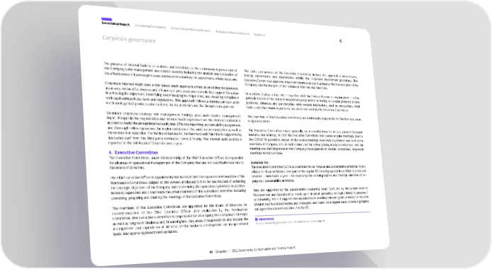 The purpose of Internal Audit is to evaluate and contribute to the continuous improvement of the Company’s risk management and control systems including the analysis and evaluation of the effectiveness of business processes and recommendations for adjustments where necessary. Corporate Internal Audit uses a risk-based audit approach aimed at providing independent assurance on the effectiveness and efficiency of processes and controls that support Givaudan in achieving its objectives, identifying and managing its major risks, and ensuring compliance with applicable policies, laws and regulations. This approach follows a business process audit methodology that provides value to both, the local entities and the Group’s management. Givaudan corporate strategy, risk management findings, past audit results, management input, changes in the organisation and Internal Audit experience are the elements taken into account to build the annual internal audit plan. Effective reporting, accountability assignment, and thorough follow-up ensure the implementation of the audit recommendation as well as the related risk reduction. For the individual audits, the internal audit function is supported by dedicated staff from the third party contractor Ernst & Young. The internal audit activity is reported to the full Board of Directors once a year. 4. Executive Committee The Executive Committee, under the leadership of the Chief Executive Officer, is responsible for all areas of operational management of the Company that are not specifically reserved to the Board of Directors. The Chief Executive Officer is appointed by the Board of Directors upon recommendation of the Nomination Committee. Subject to the powers attributed to him, he has the task of achieving the strategic objectives of the Company and determining the operational priorities. In addition, he leads, supervises and coordinates the other members of the Executive Committee, including convening, preparing and chairing the meetings of the Executive Committee. The members of the Executive Committee are appointed by the Board of Directors on recommendation of the Chief Executive Officer after evaluation by the Nomination Committee. The Executive Committee is responsible for developing the Company’s strategic as well as long-term business and financial plans. Key areas of responsibility also include the management and supervision of all areas of the business development on an operational basis, and approving investment decisions. The tasks and powers of the Executive Committee include the approval of investments, leasing agreements and divestments within the corporate investment guidelines. The Executive Committee approves important business projects, prepares the business plan of the Company and the budgets of the individual divisions and functions. In addition, it plays a key role – together with the Human Resources organisation – in the periodic review of the talent management programme, including succession planning for key positions. Alliances and partnerships with outside institutions, such as universities, think tanks and other business partners, are also monitored by the Executive Committee. The members of the Executive Committee are individually responsible for the business areas assigned to them. The Executive Committee meets generally on a monthly basis to discuss general Company business and strategy. In 2021 the Executive Committee held twelve regular meetings. Due to the COVID-19 pandemic, eleven of the twelve meetings were held in a hybrid way with some members at Company sites in Switzerland and the others joining via videoconference, and one meeting was held in person at the Company’s headquarters in Vernier, Switzerland. In general, meetings lasted two days. Sustainability The Executive Committee (EC) is accountable for our Purpose and Sustainability ambitions. Topics related to these ambitions form part of the regular EC meeting agenda in addition to dedicated sessions – held twice a year – for reviewing the overall progress and strategic direction of our purpose / sustainability ambitions. They are supported by the Sustainability Leadership Team (SLT), led by the Global Head of Procurement and Sustainability, made up of internal specialists on topics linked to purpose / sustainability. The SLT supports the organisation in reaching relevant goals, working closely with Division and functional leaders and managers, and meets on a regular basis to review progress and agree key recommendations for the EC. READ MORE On our sustainability governance: 2021 GRI sustainability report ▸ page 35 Corporate governance Governance Report Compensation Report Consolidated Financial Report Statutory Financial Report Appendix 16 Givaudan — 2021 Governance, Compensation and Financial Report