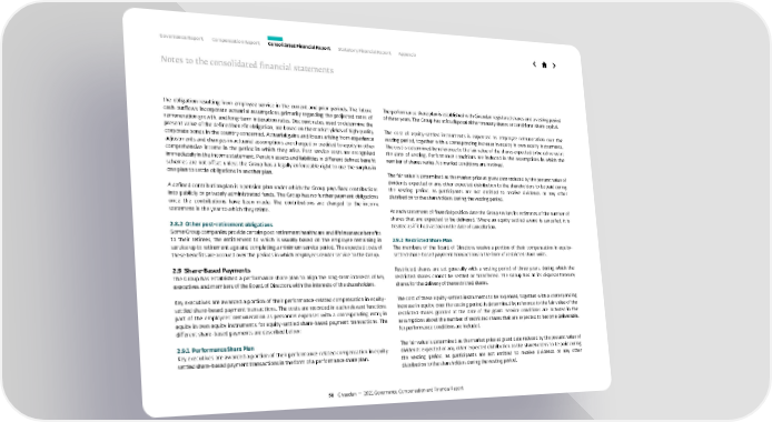 the obligation resulting from employee service in the current and prior periods. The future cash outflows incorporate actuarial assumptions primarily regarding the projected rates of remuneration growth, and long-term indexation rates. Discount rates, used to determine the present value of the defined benefit obligation, are based on the market yields of high quality corporate bonds in the country concerned. Actuarial gains and losses arising from experience adjustments and changes in actuarial assumptions are charged or credited to equity in other comprehensive income in the period in which they arise. Past service costs are recognised immediately in the income statement. Pension assets and liabilities in different defined benefit schemes are not offset unless the Group has a legally enforceable right to use the surplus in one plan to settle obligations in another plan. A defined contribution plan is a pension plan under which the Group pays fixed contributions into publicly or privately administrated funds. The Group has no further payment obligations once the contributions have been made. The contributions are charged to the income statement in the year to which they relate. 2.8.2 Other post-retirement obligations Some Group companies provide certain post-retirement healthcare and life insurance benefits to their retirees, the entitlement to which is usually based on the employee remaining in service up to retirement age and completing a minimum service period. The expected costs of these benefits are accrued over the periods in which employees render service to the Group. 2.9 Share-Based Payments The Group has established a performance share plan to align the long-term interests of key executives and members of the Board of Directors with the interests of the shareholders. Key executives are awarded a portion of their performance-related compensation in equity- settled share-based payment transactions. The costs are recorded in each relevant functions part of the employees’ remuneration as personnel expenses with a corresponding entry in equity in own equity instruments for equity-settled share-based payment transactions. The different share-based payments are described below: 2.9.1 Performance Share Plan Key executives are awarded a portion of their performance-related compensation in equity- settled share-based payment transactions in the form of a performance share plan. The performance share plan is established with Givaudan registered shares and a vesting period of three years. The Group has at its disposal either treasury shares or conditional share capital. The cost of equity-settled instruments is expensed as employee remuneration over the vesting period, together with a corresponding increase in equity in own equity instruments. The cost is determined by reference to the fair value of the shares expected to be delivered at the date of vesting. Performance conditions are included in the assumptions in which the number of shares varies. No market conditions are involved. The fair value is determined as the market price at grant date reduced by the present value of dividends expected or any other expected distribution to the shareholders to be paid during the vesting period, as participants are not entitled to receive dividends or any other distribution to the shareholders during the vesting period. At each statement of financial position date the Group revises its estimates of the number of shares that are expected to be delivered. Where an equity-settled award is cancelled, it is treated as if it had vested on the date of cancellation. 2.9.2 Restricted Share Plan The members of the Board of Directors receive a portion of their compensation in equity- settled share-based payment transactions in the form of restricted share units. Restricted shares are set generally with a vesting period of three years, during which the restricted shares cannot be settled or transferred. The Group has at its disposal treasury shares for the delivery of the restricted shares. The cost of these equity-settled instruments to be expensed, together with a corresponding increase in equity, over the vesting period, is determined by reference to the fair value of the restricted shares granted at the date of the grant. Service conditions are included in the assumptions about the number of restricted shares that are expected to become deliverable. No performance conditions are included. The fair value is determined as the market price at grant date reduced by the present value of dividends expected or any other expected distribution to the shareholders to be paid during the vesting period, as participants are not entitled to receive dividends or any other distribution to the shareholders during the vesting period. 50 Givaudan — 2021 Governance, Compensation and Financial Report Governance Report Compensation Report Consolidated Financial Report Statutory Financial Report Appendix Notes to the consolidated financial statements