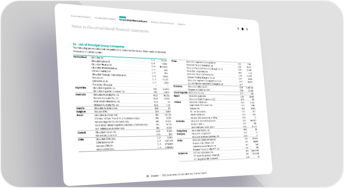 32. List of Principal Group Companies The following are the principal companies fully owned by the Group. Share capital is shown in thousands of currency units: Switzerland Givaudan SA CHF 92,336 Givaudan Suisse SA CHF 4,000 Givaudan Finance SA CHF 100,000 Givaudan International SA CHF 100 Vamara Holding SA CHF 100 Givaudan Treasury International SA CHF 1,000 Naturex AG CHF 15,288 Agthemis RE AG CHF 3,300 Fondation Givaudan – – Argentina Givaudan Argentina SA ARS 30,000 Givaudan Argentina Servicios SA ARS 8,000 Australia Givaudan Australia Pty Ltd AUD 95,726 Naturex Australia Pty Ltd AUD 0.003 drom International Pty Ltd AUD 50 Ungerer Australia Pty Ltd AUD 1,311 Austria Givaudan Austria GmbH EUR 40 Belgium Naturex SPRL EUR 1,000 Brazil Givaudan do Brasil Ltda BRL 345,381 G Nutra Ind Com Prod Alim e Nutricionais Ltda BRL 31,219 Naturex Ingredientes Naturais Ltda BRL 10,494 drom Internacional Fragrâncias Indústria e Comércio Ltda. BRL 14,388 D.D. Williamson do Brasil Ltda BRL 14,039 Canada Givaudan Canada Co CAD 12,901 Naturex Inc (Canada) CAD 500 Chile Givaudan Chile Ltda CLP 5,000 Chile Botanics SA CLP 1,837,205 Naturex Chile SA CLP 1,731,600 DDW LATAM Ltda CLP 2,484,432 China Givaudan Fragrances (Shanghai) Ltd USD 7, 7 50 Givaudan Flavors (Shanghai) Ltd USD 10,783 Givaudan Specialty Products (Shanghai) Ltd USD 12,000 Givaudan Hong Kong Ltd HKD 7, 374 Givaudan Flavors (Nantong) Ltd USD 39,000 Naturex Trading Shanghai Co Ltd CNY 5,608 Givaudan Fragrances (Guangzhou) Co Ltd CNY 14,058 D.D. Williamson Ingredients (Shanghai) Ltd CNY – Colombia Givaudan Colombia SA COP 6,965,925 Ungerer de Colombia SAS COP 39,600 Czech Republic Givaudan CR, s.r.o. CZK 200 Egypt Givaudan Egypt SAE USD 21,360 Givaudan Egypt Fragrances LLC EGP 50 France Givaudan France SAS EUR 5,006 Expressions Parfumées SAS EUR 3,548 Naturex SA EUR 14,551 SCI Les Broquetons EUR 495 Albert Vieille SAS EUR 908 Alderys SAS (ownership of 80%) EUR 13 Germany Givaudan Deutschland GmbH EUR 164,402 Naturex GmbH EUR 150 drom Perfume Trade GmbH EUR 44,276 Hong Kong drom Asia Pacific Ltd. HKD 10 Hungary Givaudan Hungary Kft EUR 15 Givaudan Business Solutions Kft EUR 12 India Givaudan (India) Private Ltd INR 129,952 Naturex India Private Ltd INR 64,416 Valentine Foods Private Ltd INR 100 Ungerer Flavours India PVT Ltd INR 100 Indonesia P.T. Givaudan Indonesia IDR 2,608,000 P.T. drom Fragrances Indonesia IDR 3,462,600 P.T. Fragrance Oils Indonesia USD 30 Governance Report Compensation Report Consolidated Financial Report Statutory Financial Report Appendix 95 Givaudan — 2021 Governance, Compensation and Financial Report Notes to the consolidated financial statements