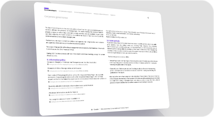 The Audit Committee meets the external auditor at least four times per year, including private sessions without the presence of management. For each meeting the external auditors prepare a report in which they comment on their activities and are available for particular questions raised by the Audit Committee. In addition the Board of Directors meets with the external auditor as well at least once per year. Furthermore, the Audit Committee reviews and approves the compensation and evaluates and approves other services provided by the external auditor. The scope of the audit is defined in an engagement letter signed by the Chairman of the Audit Committee and the Chief Financial Officer. During 2021 Deloitte attended all four of the Audit Committee meetings, except for certain closed sessions. 9. Information policy Givaudan’s Principles of Disclosure and Transparency are described in detail at: www.givaudan.com ▸ Our company ▸ Corporate governance ▸ Rules and policies Givaudan’s Articles of Incorporation can be found at: www.givaudan.com ▸ Our company ▸ Corporate governance ▸ Rules and policies Hard copies of Company publications such as the Integrated Annual Report are available on request. Corporate publications such as the Integrated Annual Report, the Half Year Report and the GRI Sustainability report can also be downloaded from Givaudan’s website at: www.givaudan.com ▸ Investors ▸ Financial results ▸ Results centre Quarterly sales information and other media releases can be found at: www.givaudan.com ▸ Investors ▸ Financial results ▸ Results centre All relevant information can also be found at: www.six-swiss-exchange.com ▸ Market data ▸ Shares ▸ Share explorer The complete calendar of events is available at: www.givaudan.com ▸ Investors ▸ Investor events ▸ Events calendar For further information please contact: Pierre Bénaich, Head of Givaudan Media and Investor Relations, Chemin de la Parfumerie 5, 1214 Vernier, Switzerland T +41 22 780 9093 E givaudan. [email protected] 10. Quiet periods To prevent transactions in Givaudan shares and related securities at times where non public price sensitive facts (as defined under art. 53Listing Rules: hereafter Price Sensitive Information) may be available with respect to Givaudan's financials, the Company has enacted blackout periods during which the members of the Board of Directors of the Company, the members of the Executive Committee and all Givaudan employees worldwide are prohibited from dealing in Givaudan shares and related securities. The blackout periods extend as follow: – Annual Report and Half Year Report: Blackout periods start 10 trading days before the end of the reporting period concerned and last until close of business on the first trading day following the publication of the report. – Quarterly sales: Blackout periods start 5 trading days before the end of the reporting period concerned and last until close of business on the first trading day following the publication of the report. Blackout periods are without prejudice to the obligation of the members of the Board of Directors of the Company, the members of the Executive Committee and all Givaudan employees worldwide to refrain from dealing in Givaudan shares and related securities at any other times when in possession of price sensitive facts (as defined under art. 53LR) relating to Givaudan. Corporate governance Governance Report Compensation Report Consolidated Financial Report Statutory Financial Report Appendix 21 Givaudan — 2021 Governance, Compensation and Financial Report