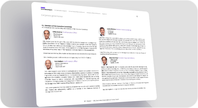 4.1 Members of the Executive Committee At 31 December 2021, the following were members of the Executive Committee: Gilles Andrier Chief Executive Officer • French national • Born in 1961 • Appointed in 2005 Gilles Andrier spent the first part of his career with Accenture in management consulting before joining Givaudan in 1993 as Fragrance Division Controller and Assistant to the Chief Executive Officer. He later held various positions including Head of Fragrance Operations in the USA and Head of Consumer Products in Europe. He was appointed Head of Fine Fragrances, Europe in 2001 before becoming Global Head of Fine Fragrances in 2003 and then CEO of Givaudan in 2005. Other mandates held by Gilles Andrier are: independent non-executive Director of Albea SA. Gilles Andrier graduated with two Masters in Engineering from ENSEEIH Toulouse. Tom Hallam Chief Financial Officer • British & Swiss national • Born in 1966 • Appointed in 2017 Tom Hallam began his career in the UK working in various industries and positions. He moved to Switzerland in 1996 to join Serono in Geneva, where he held a number of positions of increasing responsibility including Financial Director for Manufacturing Operations, and in 2001 he was appointed Vice President, Corporate Finance. Tom Hallam joined Givaudan in 2008 as Group Controller, based in Vernier, Switzerland with responsibility for financial reporting and compliance, strategic planning and management of Givaudan’s business development process. He was appointed Chief Financial Officer effective 1 January 2017. Tom Hallam graduated from the University of Manchester, UK with a BA (Hons) in Accounting and Finance and subsequently qualified as a member of the Chartered Institute of Management Accountants. Louie D’Amico President Taste & Wellbeing • US national • Born in 1961 • Appointed in 2018 Louie D’Amico began his career with Givaudan in sales as key account manager with Fries and Fries. On the merger with Givaudan Roure in 1997, he became the Head of the North America Sweet Goods business unit and later the North America Savoury business unit. In 2003, he relocated to Europe as Head of International Key Account Management and then Head of the Global Beverage business unit. In 2006, Louie D’Amico became Commercial Head of EAME. In 2010, he relocated back to the USA as Head of Flavours Americas. Effective 1 April 2018, he was appointed President of Taste & Wellbeing and a member of the Executive Committee. Louie D’Amico has a BSc in chemistry from Michigan State University. He has over 30 years of experience in the flavour industry. Maurizio Volpi President Fragrance & Beauty • Italian national • Born in 1969 • Appointed in 2015 Maurizio Volpi began his career in consumer goods with P&G and Reckitt Benckiser in Italy, working in various marketing roles. In 2000, he joined Givaudan Italy as Account Manager in Milan before moving to Argenteuil in 2003 as Head of Marketing Consumer Products Europe. Maurizio Volpi subsequently took on roles of increasing responsibility at the global level: Head of Global Marketing Consumer Products, Head of Global Marketing and Consumer Market Research for both Consumer Products and Fine Fragrances, and World Account Manager for Unilever. He was appointed Regional Head of Western and Eastern Europe (WEE) for the Consumer Products business in 2012 and in 2015 became President of Givaudan Fragrance & Beauty. Other mandates held are: member of the Boards of Directors of International Fragrance Association and the Research Institute for Fragrance Materials. Maurizio Volpi holds a degree in Economics from the Bocconi University in Milan, Italy. Corporate governance Governance Report Compensation Report Consolidated Financial Report Statutory Financial Report Appendix 17 Givaudan — 2021 Governance, Compensation and Financial Report
