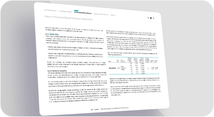 quoted market prices. Given the nature of the Group’s accounts receivable trade items, the carrying value is considered as equivalent to the fair value. 5.2.1 Market Risk The Group’s activities primarily expose it to the financial risks of changes in foreign currency exchange rates, interest rates and commodity prices. The Group enters into a number of derivative financial instruments to manage its exposure to foreign currency risk and interest rate risk, including: – Currency derivatives, mainly forward foreign exchange contracts, to hedge the exchange rate risk arising from recorded transactions; and – Interest rate swaps and other instruments to mitigate the risk of interest rate increases and/or to optimally manage interest rate costs depending on the prevailing interest rate environment. Market risk exposures are measured using sensitivity analysis. There has been no change during the year in the structure of the Group’s exposure to market risks or the manner in which these risks are managed. 5.2.1.1 Foreign Exchange Risk The Group operates across the world and is exposed to movements in foreign currencies affecting its net income and financial position. Foreign exchange risk arises from future commercial transactions, recognised assets and liabilities, and net investments in foreign operations. It is the Group’s policy to enter into derivative transactions to hedge current and forecasted foreign currency transactions, and translation risk arising from certain investments in foreign operations with a functional currency different from the Group’s presentation currency. In 2018 the Group applied hedge accounting on the net investment in foreign currency in Naturex SA with the aim of being protected from the foreign currency risk on the translation of the investment in Naturex (i.e. EUR) into the Group’s presentation currency (i.e. CHF). In total EUR 1,292 million of Euro straight bonds were designated as hedging instruments, corresponding to the net investment in Naturex. This resulted in a gain of CHF 57 million (2020: gain of CHF 7 million), recognised in currency translation differences in equity in 2021. In 2020 and 2021 the Group applied hedge accounting on the foreign currency risk related to the Euro straight bond coupons, and to the acquisitions of the cosmetic business of Indena in 2020. In 2020 the Group also applied hedge accounting on the net investment in foreign currency in Ungerer with the aim of being protected from the foreign currency risk on the translation of the investment in Ungerer (i.e. USD) into the Group’s presentation currency (i.e. CHF). The combination of a Eurobond and several cross-currency swaps as one single item are designated as a hedging instrument for a total of USD 544 million corresponding to the foreign currency principal cash flow of the cross-currency swap. In 2021 it resulted in a loss of CHF 15 million (2020: gain of CHF 51 million) recognised in currency translation differences in equity. The cross-currency swaps designated in the above mentioned hedging relationship have the following characteristics: Entity Issue date Type of instrument Notional amount in millions of EUR Notional amount in millions of USD Annual USD fixed interest rate (payment) Annual EUR fixed interest rate (receipt) Starting date Maturity date Givaudan SA 2020 Cross- currency swaps 80 87.3 2.218% 1% 22 Apr 2020 22 Apr 2027 100 108.8 2.166% 80 86.9 2.167% 80 8 7. 0 2.166% 90 9 7. 9 2.133% 70 76.2 2.126% Furthermore, Group Treasury centrally manages foreign exchange risk management activities against the functional currency of each subsidiary, and is required to hedge, whenever cost- effective, their largest exposures. The measurement of the foreign currency risk expresses the total exposure by currency, which is in the opinion of Group Treasury a representative manner to monitor the risk. It measures the cumulative foreign exchange risk of all subsidiaries of recognised assets and liabilities that are denominated in a currency (e.g. USD) that is not the subsidiary’s functional currency (e.g. other than USD). 60 Givaudan — 2021 Governance, Compensation and Financial Report Governance Report Compensation Report Consolidated Financial Report Statutory Financial Report Appendix Notes to the consolidated financial statements