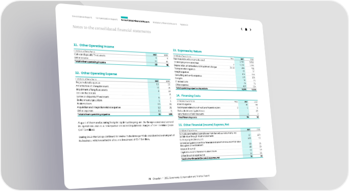 11. Other Operating Income in millions of Swiss francs 2021 2020 Gains on disposal of fixed assets 4 4 Other income 31 41 Total other operating income 35 45 12. Other Operating Expense in millions of Swiss francs 2021 2020 Project related expenses 13 15 Amortisation of intangible assets 14 16 Impairment of long-lived assets 3 13 Loss on divestment – 8 Losses on disposal of fixed assets 6 2 Environmental provisions 1 1 Business taxes 19 20 Acquisition and integration related expenses 12 25 Other expenses 13 9 Total other operating expense 81 109 As part of the manufacturing footprint optimisation program, the Group restructured some of its operations and as a consequence recorded impairment charges of CHF 3 million (2020: CHF 13 million). During 2020 the Group continued to review its business portfolio and divested a small part of its business, which resulted in a loss on divestment of CHF 8 million. 13. Expenses by Nature in millions of Swiss francs Note 2021 2020 Raw materials and consumables used 2,735 2,668 Total employee remuneration 8 1,596 1,493 Depreciation, amortisation and impairment charges 21, 22 393 401 Transportation expenses 11 17 Freight expenses 178 153 Consulting and service expenses 129 126 Energies 76 73 IT related costs 70 71 Other expenses 407 324 Total operating expenses by nature 5,595 5,326 14. Financing Costs in millions of Swiss francs Note 2021 2020 Interest expense 86 80 Net interest related to defined benefit pension plans 8 5 6 Derivative interest (gains) losses (2) Amortisation of debt discounts 3 2 Total financing costs 94 86 15. Other Financial (Income) Expense, Net in millions of Swiss francs 2021 2020 Fair value and realised (gains) losses from derivatives instruments, net (at fair value through income statement) 67 (37) Exchange (gains) losses, net (43) 52 Unrealised (gains) losses from financial instruments measured at fair value through income statement (8) (4) Interest (income) (8) (3) Capital taxes and other non-business taxes 10 10 Other (income) expense, net 12 16 Total other financial (income) expense, net 30 34 Governance Report Compensation Report Consolidated Financial Report Statutory Financial Report Appendix 78 Givaudan — 2021 Governance, Compensation and Financial Report Notes to the consolidated financial statements