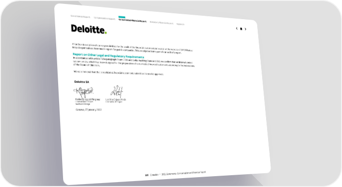 A further description of our responsibilities for the audit of the financial statements is located at the website of EXPERTsuisse: http://expertsuisse.ch/en/audit-report-for-public-companies. This description forms part of our auditor’s report. Report on Other Legal and Regulatory Requirements In accordance with article 728a paragraph 1 item 3 CO and Swiss Auditing Standard 890, we confirm that an internal control system exists, which has been designed for the preparation of consolidated financial statements according to the instructions of the Board of Directors. We recommend that the consolidated financial statements submitted to you be approved. Deloitte SA Karine Szegedi Pingoud Laetitia Cejudo Petit Licensed Audit Expert Licensed Audit Expert Auditor in Charge Geneva, 27 January 2022 105 Givaudan — 2021 Governance, Compensation and Financial Report Governance Report Compensation Report Consolidated Financial Report Statutory Financial Report Appendix