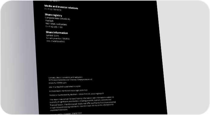 Givaudan SA Chemin de la Parfumerie 5 1214 Vernier, Switzerland General information T + 41 22 780 91 11 Media and investor relations T + 41 22 780 90 53 Share registry Computershare Schweiz AG Postfach 4601 Olten, Switzerland T + 41 62 205 77 00 Share information Symbol: GIVN Security number: 1064593 ISIN: CH0010645932 l l e h s t u n a N 1 I 2 0 2 Concept, design, consulting and realisation: PETRANIX Corporate and Financial Communications AG www.PETRANIX.com 2021 In a Nutshell is published in English. All trademarks mentioned enjoy legal protection. Printed in Switzerland by Neidhart + Schön Print AG, www.nsgroup.ch This report may contain forward-looking information. Such information is subject to a variety of significant uncertainties, including scientific, business, economic and financial factors. Therefore actual results may differ significantly from those presented in such forward-looking statements. Investors must not rely on this information for investment decisions. Picture credits: Givaudan, Shutterstock © Givaudan SA, 2022 www.givaudan.com