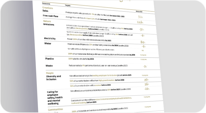 20 Progress against our targets OUR 2025 STRATEGY Progress against our targets Focus area Targets Status 2021 Actions and measures Creations 7.1% Sales Average organic sales growth of 4–5% on a like-for-like basis between 2021–2025 Focusing on our strategic growth drivers, focusing on renewable, biodegradable and viable natural solutions; addressing health and wellbeing issues; expanding our portfolio; greater collaboration and co-creation; Exploiting AI and digital opportunities; increasing Free cash flow Average free cash flow of at least 12% of sales between 2021–2025 12.6% operational efficiencies. Nature Emissions OPERATIONS: Our operations’ carbon emissions (scope 1 + 2) will be cut by 70% before 2030 –31% Setting an internal carbon price; fixing site environmental targets and assessments; switching to renewable energy sources; Promoting and will be climate positive before 2040 (baseline 2015) energy efficiencies; Signing the UN pledge 'Business Ambition for 1.5°C'. SUPPLY CHAIN: Our supply chain emissions (scope 3) will be cut by 20% before 2030 and will –4% Sourcing ingredients responsibly; developing low-carbon creations; driving circularity and upcycling; optimising packaging, logistics, be climate positive before 2050 (baseline 2015) transport of goods, and business/private travel. Electricity Power 100% of our sites with renewable electricity by 2025 4% Committing to RE100 since 2015; setting site renewable electricity targets; generating electricity on site. Water Improve water efficiency by 25% on sites facing water stress by 2030 (baseline 2020) 8 –4% Driving continuous improvement using the 3R approach: 'reduce, reuse and recycle'; Identifying shared water challenges and local We will continuously improve water efficiency on all other sites flat stakeholder priorities in the watershed; implementing our wastewater standard; carrying out water risk assessments; tracking site water quantity and quality. 100% of our wastewater discharge will meet or exceed regulatory and industry standards by 2030 in progress Plastics 100% plastics circularity by 2030 in progress Becoming members of the advisory board of the Renewable Carbon Initiative (RCI); co-leading a WBCSD plastic and packaging workgroup defining a transition for B2B chemical products; reducing our plastic usage and consumption. Waste Reduce waste by 4% per tonne of product, year-on-year average (baseline 2015) –2% ¹ Applying circular principles in product design, sourcing, manufacturing and packaging; upcycling to re-use materials normally disposed of; acting on the principle of 'no waste by design'. People Diversity and We will be rated amongst the leading employers for inclusion globally before 2025 in progress Building more inclusive hiring practices: Inclusive job ads; balanced slates for hiring and promotion; hiring manager training. inclusion 50% of our senior leaders will be from high growth markets before 2030 26% Fostering inclusive leadership development: Evolving our Leadership Development programmes; Better Balance approach; managing unconscious bias at work. 50% of our senior leaders will be women before 2030 26% Caring for We will reduce our total recordable injury rate by 50% before 2025 (baseline 2018) –22% Investing in our plant and technical equipment; further developing our Responsible Care Management System; conducting periodic employee assessment of risk and control on-site; expanding our behavioural safety programme: advanced safety leadership training and safety, health comprehensive worker trainings on health and safety. and mental Everyone on our sites will have access to mental and physical health initiatives, in progress Providing access to mental and physical health initiatives, tools and training for all employees such as: Employee Assistance wellbeing tools and training before 2025 Programme ; Happier, healthier habits circles; health and wellbeing communities of practice, Communities Sourcing 100% of materials and services sourced responsibly by 2030 (baseline 2021) in progress Implementing our Sourcing4Good programme; responsible sourcing policy. responsibly Communities Ambition to improve the lives of millions of people in communities where we source and in progress Through employee activities, Green Teams and the Givaudan Foundation, develop initiatives that: respond to the needs within benefit by operate by 2030 - targets being determined communities; support activities ranging from health and education to enhancing environmental and agricultural practices. working with us 1. Absolute reduction since 2015. Givaudan – 2021 In a Nutshell