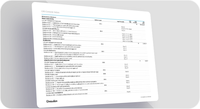 GRI Content Index SASB UNGC SDG GRI Standard and Disclosure Publication year Page/Information Code Principles Goals Water stewardship 8 6, 8, 12, 17 GRI 103: Management Approach 2016 Disclosure 103 – 1 Explanation of the material topic and its boundary SR p 68 Disclosure 103 – 2 The management approach and its components SR p 68 RT-CH-140a.3 Disclosure 103 – 3 Evaluation of the management approach SR p 68 GRI 303: Water and Effluents 2018 Disclosure 303 – 1 Interactions with water as a shared resource SR p 68 RT-CH-140a.3 Disclosure 303 – 2 Management of water discharge-related impacts SR p 68 RT-CH-140a.3 Disclosure 303 – 3 Water withdrawal SR p 73 RT-CH-140a.1 Disclosure 303 – 4 Water discharge SR p 73 RT-CH-140a.1 Disclosure 303 – 5 Water consumption SR p 73 RT-CH-140a.1 Biodiversity 8 2, 15, 17 GRI 103: Management Approach 2016 Disclosure 103 – 1 Explanation of the material topic and its boundary SR p 75 Disclosure 103 – 2 The management approach and its components SR p 75 Disclosure 103 – 3 Evaluation of the management approach SR p 75 GRI 304: Biodiversity 2016 Disclosure 304 – 1 Operational sites owned, leased, managed in, or adjacent to, protected areas and areas of high biodiversity value outside protected areas SR p 76 Disclosure 304 – 2 Significant impacts of activities, products, and services on biodiversity SR p 76 Disclosure 304 – 3 Habitats protected or restored SR p 77 Diversity, inclusion & people development 6 5, 8, 17 GRI 103: Management Approach 2016 Disclosure 103 – 1 Explanation of the material topic and its boundary SR p 87 Disclosure 103 – 2 The management approach and its components SR p 87 Disclosure 103 – 3 Evaluation of the management approach SR p 87 GRI 202: Market Presence 2016 Disclosure 202 – 1 Ratios of standard entry level wage by gender compared to local minimum wage SR p 89 GRI 401: Employment 2016 Disclosure 401 – 1 New employee hires and employee turnover SR p 90 Disclosure 401 – 3 Parental leave SR p 91 GRI 404: Training and Education 2016 Disclosure 404 – 2 Programs for upgrading employee skills and transition assistance programs SR p 91 Disclosure 404 – 3 Percentage of employees receiving regular performance and career development reviews SR p 92 GRI 405: Diversity and Equal Opportunity 2016 Disclosure 405 – 1 Diversity of governance bodies and employees SR p 89 Disclosure 405 – 2 Ratio of basic salary and remuneration of women to men SR p 89 GRI 406: Non-discrimination 2016 Disclosure 406 – 1 Incidents of discrimination and corrective actions taken SR p 89 © Givaudan SA, January 2022