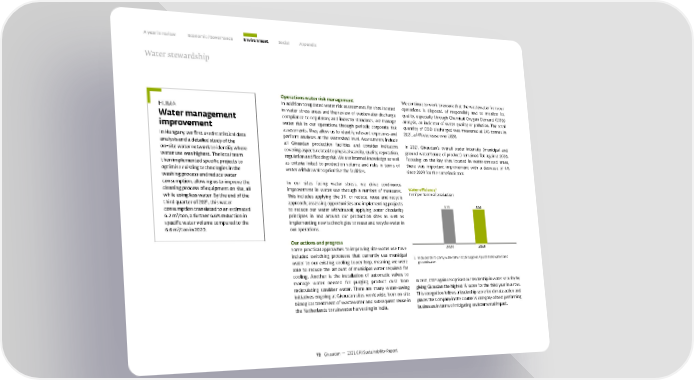 A year in review Economic / Governance Environment Social Appendix Water stewardship Operations water risk management We continue to work to ensure that the wastewater from our In addition to updated water risk assessments for sites located operations is disposed of responsibly and to monitor its HUMA in water stress areas and the review of wastewater discharge quality, especially through Chemical Oxygen Demand (COD) Water management compliance to regulatory and industry standards, we manage analysis, an indicator of water quality or pollution. The total improvement water risk in our operations through periodic corporate risk quantity of COD discharged was measured at 245 tonnes in assessments. They allow us to identify relevant exposures and 2021, a 14% decrease over 2020. In Hungary, we first used statistical data perform analyses at the watershed level. Assessments include analysis and a detailed study of the all Givaudan production facilities and consider indicators In 2021, Givaudan’s overall water intensity (municipal and on-site water network to identify where covering aspects related to physical scarcity, quality, reputation, ground water/tonne of product) remained flat against 2020. water use was highest. The local team regulation and flooding risk. We use internal knowledge as well Focusing on the key sites located in water-stressed areas, then implemented specific projects to as criteria linked to production volume and risks in terms of there was important improvement with a decrease of 4% optimise existing technologies in the water withdrawal to prioritise the facilities. since 2020 for the same indicator. washing process and reduce water consumption, allowing us to improve the In our sites facing water stress, we drive continuous cleaning process of equipment on site, all improvement in water use through a number of measures. Water efficiency ¹ while using less water. By the end of the This includes applying the 3R, or reduce, reuse and recycle In m³ per tonne of production third quarter of 2021, this water approach; assessing opportunities and implementing projects . . consumption translated to an estimated to reduce our water withdrawal; applying water circularity 6.2 m³/ton, a further 6.6% reduction in principles in and around our production sites as well as specific water volume compared to the implementing new technologies to reuse and recycle water in 6.6 m³/ton in 2020. our operations. Our actions and progress Some practical approaches to improving site water use have 2020 2021 included switching processes that currently use municipal 1. Includes third-party water (municipal supplies / purchased water) and water to our existing cooling tower loop, meaning we were groundwater. able to reduce the amount of municipal water required for cooling. Another is the installation of automatic valves to manage water needed for purging product dust from In 2021, CDP again recognised our leadership in water security by recirculating scrubber water. There are many water-saving giving Givaudan the highest ‘A’ score for the third year in a row. initiatives ongoing at Givaudan sites worldwide, from on-site This recognition follows a leadership score for climate action and biological treatment of wastewater and subsequent reuse in places the Company in the double ‘A’ category of best performing the Netherlands to rainwater harvesting in India. businesses in terms of mitigating environmental impact. 72 Givaudan — 2021 GRI Sustainability Report