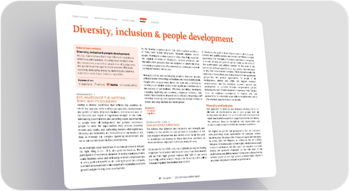 A year in review Economic / Governance Environment Social Appendix Diversity, inclusion & people development As the leading employer in its field with a global workforce At Givaudan, the path to leadership is open to all motivated, Material topic definition of more than 16,800 employees, Givaudan depends on its talented and qualified people and we are committed to equal Diversity, inclusion & people development people. Working in a wide variety of roles, they help transform opportunity. Our Principles of Conduct state that it is our policy Having a balanced workforce that reflects the societies in the original creations of Givaudan’s talented perfumers and to recruit, employ and promote people solely on the basis of which Givaudan operates, including the elimination of all flavourists into products that are designed to satisfy the most the qualifications and abilities needed for the work to be discrimination to ensure that people from all backgrounds demanding requirements. These innovative, creative professionals performed without regard to race, age, gender, national origin and gender have the opportunity to succeed. Effectively are fundamental to our success. or any other non-relevant category. This is fundamentally the recruiting, developing, engaging, deploying and retaining right way of doing things and makes sense from an operational talent that meets future business imperatives. Managing talent and encouraging people is therefore another perspective. We provide opportunities for people of all critical element of meeting our business and sustainability goals. backgrounds, gender and origin. We support women’s Purpose pillars People who are passionate about our work and committed to empowerment and the associated economic growth and CREATIONS NATURE PEOPLE COMMUNITIES creating a sustainable society make significant contributions to development of societies through compensation policies the success of our business. Effectively recruiting, developing, including the ratio of remuneration of women to men. We also engaging, deploying and retaining a balanced workforce that focus on employee development to improve skills and Disclosure 103 – 1 meets future business imperatives is critical to improving staff productivity, to constantly adapt skills to requirements and to EXPLANATION OF THE MATERIAL retention, reducing costs and increasing our revenue. It helps us offer the best opportunities to our people. TOPIC AND ITS BOUNDARY attract and keep the best and the brightest. Having a diverse workforce that reflects the societies in Diversity and inclusion which we operate, with multiple perspectives, backgrounds Boundary Our approach to diversity and inclusion involves efforts to and points of view, improves business decisions because of • Givaudan eliminate all discrimination and to give people from all the breadth and depth of experience brought to the table. • Suppliers backgrounds the chance to succeed. We seek to attract local Eliminating discrimination and providing equal opportunities talent and industry experts to support growth in all markets. to people from all backgrounds and genders empowers Disclosure 103 – 2, 103 – 3 We embrace diversity throughout our organisation and people to seize the opportunities they deserve, boosting MANAGEMENT APPROACH recruit to build a representative and inclusive workforce. morale and loyalty and cultivating leaders with legitimacy. We believe that diversity and inclusivity add strength and Diversity and inclusivity are then critical to our business and balance to our workforce and we look to contribute to full We implement policies and programmes that are consistent help us manage our complex operating environment and and engaged employment and decent work for all. We want with promoting equal opportunities for everyone, without serve our customers in the best possible way. to accelerate our journey in these directions and have set discrimination. We ensure that Givaudan respects human rights three ambitious objectives to help us along the way. by acting with due diligence, as defined in the UN Guiding As an example, equal treatment of women and men is not just Principles for Business and Human Rights, which include a right the right thing to do – it is also good for business. The full We intend, before 2025, to be rated globally among the leading to non-discrimination. We also expect our suppliers to recruit, participation of women at Givaudan, including equal pay, makes employers for inclusion. Before 2030, 50% of our senior leaders employ and promote employees on the sole basis of the sound business sense and embracing women’s empowerment will be from high growth markets and 50% of our senior qualifications and abilities needed for the work to be performed, as a key goal will benefit us all. Looking beyond the company, leadership will be women. Progress in these objectives will be without regard to race, age, gender, national origin, religion or women’s empowerment is also essential to expanding economic measured against the baseline year of 2018. any other category not relevant to performance. growth and promoting social development. 87 Givaudan — 2021 GRI Sustainability Report