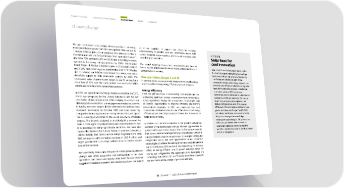 A year in review Economic / Governance Environment Social Appendix Climate change We are committed to becoming climate positive – removing all of our suppliers to support our efforts by working more greenhouse gases from the atmosphere than we put in collaboratively to provide data and information about their HYCOOL – before 2050 as part of our purpose. One element of this is carbon footprint when required, and to work to reduce their Solar heat for that Givaudan will cut GHG emissions from operations (scope 1 overall impact over time. and 2) by 70% between 2015 and 2030 and is working towards cool innovation operations becoming climate positive by 2040. The Science Our overall roadmap focuses first on reduction and then on Based Targets initiative (SBTi) has approved Givaudan’s scope 1 balancing remaining/unavoidable emissions with neutralisation/ Our site in Sant Celoni, Spain hosts a pilot and 2 GHG reduction target as being in line with 1.5° C. We also compensation measures. for HyCool, a groundbreaking technology aim to achieve our RE100 commitment to convert our entire for industrial cooling systems. Funded by electricity supply to fully renewable sources by 2025. The Our operations (scope 1 and 2) the European Union, the aim of the Company’s value chain emission target (scope 3), aiming for a In our operations, we are primarily focused on renewable energy innovative energy technology project is to reduction of 20% over the same period, also meets the SBTi’s sources and increasing energy efficiency to reach our goals. develop cost-effective solutions using solar criteria and is in line with current best practice. heat for industrial purposes. Installation Energy efficiency started in summer 2021 and, once In 2019, we signed the UN Pledge Business Ambition for 1.5°C, Here, our primary focus is on reducing consumption and we completed, and at full scale, is expected to which was proposed by the United Nations to aim for net- are leading significant energy consumption reduction projects reduce site GHG emissions by 3%, reduce zero value chain emissions by 2050. Helping to validate our across operations. Energy site assessments, for example, help electricity and gas consumption, and climate positive ambition, our engagement means we commit us identify opportunities to improve efficiency and identify deliver refrigeration with 25% greater to having net-zero targets in line with the new SBTi net-zero conservation measures. In 2021, we conducted four such efficiency. This will help us deliver on our standard, introduced in October 2021 and road tested by assessments. Other investments and efforts in terms of energy goals to reduce our Scope 1 and 2 GHG companies including Givaudan. In September 2020, we signed efficiency plans and targeted projects have also allowed us to emissions and lessen our overall carbon the CLG Europe CEO letter to the EU on 2030 GHG emissions make improvements. footprint through the use of high targets. The letter is designed, at a critical policy moment, to innovation technologies. If it proves cost send a clear signal to policymakers and other businesses that Ambitious GHG emission reduction is not possible without an effective, we will be able to use it in it is essential to ramp up climate ambition. We have also evolution of the technologies we use. We seek opportunities to countries with even more favourable signed the Business for Nature ‘Nature is everyone’s business’ partner with experts from diverse fields in finding new ways to weather conditions such as Mexico, South call-to-action. The call-to-action brings together more than improve our environmental performance. In particular, we look at Africa or Singapore. 500 companies with combined revenue of USD 4 trillion and energy-intensive steps in our processes, for example, cooling and urges governments to adopt policies now to reverse nature refrigeration needs, and seek opportunities to use alternative loss in this decade. technologies to achieve the same performance and jointly reduce our GHG emissions. We have found that solar energy, for instance, We constantly assess and mitigate the risks posed by climate offers an energy-efficient way to power industry’s needs for change and drive adaptation and remediation in our own cooling and refrigeration. The opportunity is in developing the operations and across our supply chain, from the raw material technology that will be able to efficiently and reliably respond to suppliers to indirect materials and service providers. We expect variable needs across a range of processes and sites. 52 Givaudan — 2021 GRI Sustainability Report