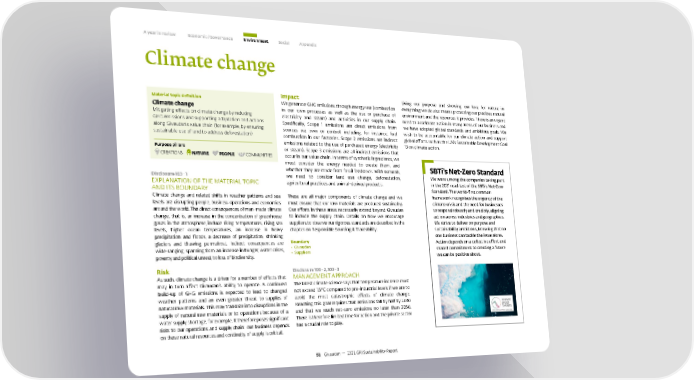 A year in review Economic / Governance Environment Social Appendix Climate change Material topic definition Impact Living our purpose and showing our love for nature in Climate change We generate GHG emissions through energy use (combustion everything we do also means protecting our precious natural in our own processes as well as the use or purchase of environment and the resources it provides. There is an urgent Mitigating effects on climate change by reducing electricity and steam) and activities in our supply chain. need to accelerate action in many areas of our business and GHG emissions and supporting adaptation and actions Specifically, Scope 1 emissions are direct emissions from we have adopted global standards and ambitious goals. We along Givaudan’s value chain (for example, by ensuring sources we own or control, including, for instance, fuel wish to be accountable for our climate action and support sustainable use of land to address deforestation). combustion in our factories. Scope 2 emissions are indirect global efforts such as the UN’s Sustainable Development Goal emissions related to the use of purchased energy (electricity 13 on climate action. Purpose pillars or steam). Scope 3 emissions are all indirect emissions that CREATIONS NATURE PEOPLE COMMUNITIES occur in our value chain. In terms of synthetic ingredients, we must consider the energy needed to create them, and SBTi’s Net-Zero Standard whether they are made from fossil feedstock. With naturals, Disclosure 103 – 1 we need to consider land use change, deforestation, We were among the companies taking part EXPLANATION OF THE MATERIAL TOPIC agricultural practices and animal-derived products. in the 2021 road test of the SBTi’s Net-Zero AND ITS BOUNDARY Standard. The world-first common Climate change and related shifts in weather patterns and sea These are all major components of climate change and we framework recognises the urgency of the levels are disrupting people, business operations and economies must ensure that our raw materials are produced sustainably. climate crisis and the need for businesses around the world. The direct consequences of man-made climate Our efforts in these areas necessarily extend beyond Givaudan to respond robustly and credibly, aligning change, that is, an increase in the concentration of greenhouse to include the supply chain. Details on how we encourage action across industries and geographies. gases in the atmosphere, include rising temperatures, rising sea suppliers to observe our rigorous standards are described in the We strive to deliver on purpose and levels, higher ocean temperatures, an increase in heavy chapter on Responsible Sourcing & Traceability. sustainability ambitions, knowing that no precipitation and floods, a decrease of precipitation, shrinking one business can tackle the issue alone. glaciers and thawing permafrost. Indirect consequences are Boundary Action depends on a collective effort and wide-ranging, spanning from an increase in hunger, water crises, • Givaudan shared commitment to creating a future poverty and political unrest, to loss of biodiversity. • Suppliers we can be positive about. Risk Disclosure 103 – 2, 103 – 3 As such, climate change is a driver for a number of effects that MANAGEMENT APPROACH may in turn affect Givaudan’s ability to operate. A continued The latest climate science says that temperature increase must build-up of GHG emissions is expected to lead to changed not exceed 1.5°C compared to pre-industrial levels if we are to weather patterns and an even greater threat to supplies of avoid the most catastrophic effects of climate change. natural raw materials. This may translate into disruptions in the Reaching this goal requires that emissions fall by half by 2030 supply of natural raw materials or to operations because of a and that we reach net-zero emissions no later than 2050. water supply shortage, for example. It therefore poses significant There is therefore limited time for action and the private sector risks to our operations and supply chain: our business depends has a crucial role to play. on these natural resources and continuity of supply is critical. 51 Givaudan — 2021 GRI Sustainability Report