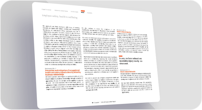 A year in review Economic / Governance Environment Social Appendix Employee safety, health & wellbeing We approach and help employees with ways of working We also continue to ensure the compliance of our Disclosure 403 – 9 through our Spark your Senses Learning and Development classification and labelling for all products (raw materials, Work-related injuries Newsletter, our Humantech Office Ergonomics tool, our IT intermediates and finished products) that we sell, produce In helping meet our ambition to reduce our total recordable collaboration tool guides as well as local HR and EHS team and ship. We harmonise and optimise packages and labels. injury rate (TRCR) by 50% by 2025 compared to the 2018 support. We continued to provide support and resources for baseline, we are expanding our focus to take into account all employees in 2021. Many regions held training sessions to help We review our labelling in relation with industry association medical cases as well as lost time injuries (LTIs). Our TRCR is employees to be more effective with virtual working and a flex standards annually. The labelling manual is a coordinated the total of lost time injuries, restricted work cases and medical working toolkit is also being introduced locally to support effort of the Fragrance and Flavour industry and results from treatment cases per 200,000 hours worked. The number of employees and managers. This year we published three issues a review of classification and labelling information for our actual cases increased relative to previous years because of the of the Spark your Senses Learning and Development newsletter ingredients, covering both synthetics and natural complex inclusion of cases from recently acquired companies, yet the to support colleagues during COVID-19. They focused on how substances. Internal and external stakeholders impacted by reduction in our recordable injury rate points to our success in listening is a great way to support each other and help each changes were informed in advance and the new classification embedding a positive and long-term culture of health and other during this time; finding balance and staying connected, and labelling information was updated in June. We have seen safety. We are well on track to reaching our target. with a focus on addressing Webex fatigue and, finally, an issue very smooth and successful implementation. on embracing digital learning, where we celebrated a year as we transitioned to remote/virtual learning because of the The Product Stewardship Team also reviews Safety Data Sheets In 2021, we have reduced our pandemic. In addition, we continue to support our colleagues (SDS) and is continuously improving this documentation in with the Humantech office ergonomics tool that works both at relation with industry association standards, new regulations recordable injury rate by –22% work and in the home office. We also provided IT collaboration or additional information. The Safety Data Sheets (SDS) mainly since 2018. tools for continuous development and tips and hints. provide information on chemical identity & physical/chemical properties; hazards for health, safety, environment; preventive Disclosure 403 – 7 and emergency response measures, disposal instructions as Prevention and mitigation of occupational well as medical advice. SDS of raw materials are provided to Disclosure 403 – 10 health and safety impacts directly linked by our employees, while those of finished goods are supplied to Work-related ill health business relationships our customers. We have a number of measures for helping our employees avoid We look to prevent and mitigate occupational health and safety work-related ill health. The exposure control programme helps impacts linked by business relationships through a number of We look to prevent and mitigate occupational health and find the limit of exposure for each chemical and facilitate the approaches. We ask, for example, certain suppliers to carry out safety impacts linked by business relationships through a development of engineering or other techniques to lessen it. an audit – the Sedex Members Ethical Trade Audit, SMETA – as number of approaches. We continue, for instance, to ensure validation of their commitment to our key responsible sourcing the compliance of our classification and labelling for all We have been extending industrial and office ergonomics pillar of Health & Safety. More information can be found in the products (raw materials, intermediates and finished products) initiatives as described above. Such measures allow us to reduce chapter on Responsible Sourcing & Traceability. that we sell, produce and ship. We harmonise and optimise incidents and improve the long-term health and wellbeing of all packages and labels. employees. Ergonomic assessment in operations is carried out by experts, while self-assessment in the office is carried out via digital training. 99 Givaudan — 2021 GRI Sustainability Report