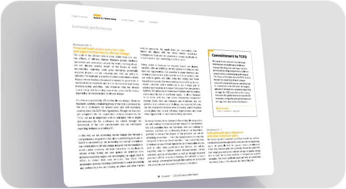 A year in review Economic / Governance Environment Social Appendix Economic performance Disclosure 201 – 2 most in operations, the supply chain and communities. Our Financial implications and other risks targets are aligned with the United Nations Sustainable Committment to TCFD and opportunities due to climate change Development Goals and our attention is focused specifically on The scale of the climate crisis is more visible than ever, and activities related and contributing to SDGs 6 and 12. Financial markets need clear, thorough the effects of climate change threaten people, business information on the impacts of climate operations and economies around the world. Looking ahead, Taking action to decrease our negative impact and aligning change including risks and opportunities we are already acutely aware of the issues at stake: ourselves with an ambitious climate agenda also helps us turn presented by rising temperatures, climate- uncontrolled warming could pose numerous potentially risks into opportunities. Our expertise in green chemistry and related policy and emerging technologies. negative impacts on our company and limit our ability to techniques such as biocatalysis enable us to make products that The Financial Stability Board’s TCFD aims to operate. For example, a scarcity of water could have a severe are high in purity and yield, using less energy and fewer bolster the reporting of such climate- impact on our business because it is needed to grow most of hazardous materials. Our innovation teams are working on side- related financial information and Givaudan our natural raw materials and also as an essential input in our stream valuation, which enables us to use a larger part of is committed to the initiative. We largely manufacturing activities. Raw materials that are already existing raw materials or to reuse food waste from our partners’ address it through our extensive reporting scarce today risk becoming even more scarce in the future, facilities. This allows us to create raw materials with less energy through the CDP, a not-for-profit charity depending on the evolution of climate change. and reduces the risk of insufficient supply – it allows Givaudan that runs the global disclosure system for to do more with less. Our Water Stewardship Programme investors, companies and governments to As a business potentially affected by climate change, Givaudan ensures water risks are managed and monitored, and we manage their environmental impacts. has been carefully considering many of the topics addressed by prioritise places where water challenges are expected. We carry the TCFD disclosures for several years and with increasing out risk assessments in these areas to develop water mitigation READ MORE scrutiny since the 2015 Paris Agreement. Though we have not action plans that include efficiency improvements and water TCFD Recommendations ▸ page 128 yet completed the full quantitative analysis required by the reuse opportunities at our manufacturing operations. TCFD, we are in alignment with its principles. This is largely demonstrated by the disclosures we submit through the As we go forward in our journey to becoming climate positive, framework of the CDP questionnaire and our subsequent we will continue to make important changes to our business. reporting, included as a table p127. We will scrutinise how we formulate, how we continue to innovate and how we continuously improve our ingredients Disclosure 201 – 3 To this end, we are addressing climate change risk through a portfolio to reduce the impact of our products. We will be Defined benefit plan obligations comprehensive programme that aims to both mitigate it and to rethinking movement – from the transportation of materials and other retirement plans turn it to our advantage. We are looking, for example, to minimise and goods to how we travel ourselves – and considering how The Group operates a number of defined benefit and defined our contribution to climate change and promote the transition to to reduce our use of fossil fuels in favour of renewable sources contribution plans throughout the world and the corresponding a low carbon economy. We have committed to excellence in such as solar, wind, geothermal and biofuels. We will be assets are generally held in separate trustee-administered climate action, basing our own agenda on ambitious GHG exploring ways to capture carbon through natural climate funds. The pension plans are generally funded by payments emission reduction targets and encouraging our supply chain in solutions such as reforestation as well as through industrial from employees and by the relevant Group companies, taking efforts to reduce their own emissions. Our Water Policy processes offered to us by technology. We will look to reduce into account the recommendations of independent qualified emphasises our long-standing commitment to water stewardship our energy consumption through innovations in production actuaries. The most significant plans are held in Switzerland, and outlines how we are focusing on where and what matters infrastructure and increased efficiencies at our plants. the United States of America and the United Kingdom. 30 Givaudan — 2021 GRI Sustainability Report