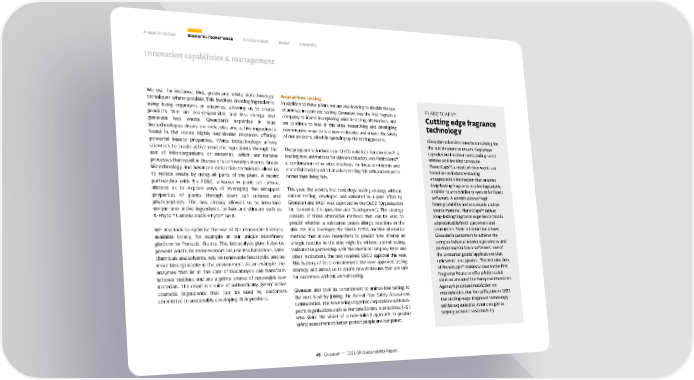 A year in review Economic / Governance Environment Social Appendix Innovation capabilities & management We use, for instance, blue, green and white biotechnology Animal-free testing techniques where possible. This involves creating ingredients In addition to these pillars, we are also looking to abolish the use PLANETCAPS™ using living organisms or enzymes, allowing us to create of animals in cosmetic testing. Givaudan was the first fragrance Cutting edge fragrance products that are eco-responsible, use less energy and company to invest in exploring animal-testing alternatives, and generate less waste. Givaudan’s expertise in blue we continue to lead in this area, researching and developing technology biotechnologies draws on molecules and active ingredients non-invasive ways to test new molecules and ensure the safety found in the ocean, highly sustainable resources offering of our products, all while speeding up the testing process. Givaudan scientists have been striving for powerful beauty properties. White biotechnology allows the last six years to ensure fragrances scientists to create active cosmetic ingredients through the The programme includes our OECD validated KeratinoSens®, a capsules both deliver outstanding scent use of microorganisms or enzymes, which are natural leading non-animal test for skin sensitisation, and PebitoSens™, release and are kind to nature. processes that result in the use of eco-friendly solvents. Green a combination of in vitro methods for bioaccumulation and PlanetCaps™, a result of their work, are biotechnology and advanced extraction techniques allow us acute fish toxicity which involves testing fish cells and enzymes based on an industry-leading to reduce waste by using all parts of the plant. A recent rather than living fish. encapsulation innovation that enables partnership with Bio FD&C, a leader in plant cell culture, long-lasting fragrance in a biodegradable allowed us to explore ways of leveraging the untapped This year, the world’s first toxicology testing strategy without and bio-sourced delivery system for fabric properties of plants through stem cell cultures and animal testing, developed and validated in a joint effort by softeners. A combination of high phytopeptides. This has already allowed us to introduce Givaudan and BASF, was approved by the OECD (Organisation biodegradability and renewable carbon unique new active ingredients for hair and skincare such as for Economic Co-operation and Development). The strategy source material, PlanetCaps™ deliver K-Phyto™ Camelia and K-Phyto™ GHK. consists of three alternative methods that can be used to long-lasting fragrance experience that is predict whether a substance causes allergic reactions in the appreciated by both customers and We also look to optimise the use of the renewable biomass skin. We also developed the Kinetic DPRA, another alternative consumers. Their introduction allows available locally, for example at our unique biorefinery method that allows researchers to predict how intense an Givaudan’s customers to achieve the platform in Pomacle, France. This biocatalysis plant helps us allergic reaction in the skin might be without animal testing. complex balance between greenness and prevent waste, be more economical, use less hazardous, safer Validated in partnership with the chemical company BASF and performance in fabric softeners, one of chemicals and solvents, rely on renewable feedstocks, and be other institutions, the test received OECD approval this year. the consumer goods’ applications that more biodegradable in the environment. As an example, the This battery of tests complements the now approved testing relies most on capsules. The introduction enzymes that lie at the core of biocatalysis can transform strategy and allows us to create new molecules that are safe of PlanetCaps™ makes Givaudan the first leftover residues and are a prime source of renewable raw for customers without animal testing. fragrance house to offer a fully scaled materials. The result is a suite of authentically ‘green’ active solution ahead of the European Chemicals cosmetic ingredients that can be used by customers Givaudan also took its commitment to animal-free testing to Agency’s proposed restriction on committed to sustainably developing their products. the next level by joining the Animal-Free Safety Assessment microplastics, due for ratification in 2022. Collaboration. The AFSA brings together corporations with non- The cutting-edge fragrance technology profit organisations such as Humane Society International (HSI), will be expanded to other categories, who share the vision of a non-animal approach to product helping us boost sustainability. safety assessment to better protect people and our planet. 45 Givaudan — 2021 GRI Sustainability Report