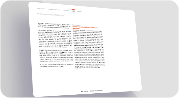 A year in review Economic / Governance Environment Social Appendix Local community development and natural resources. Every precaution is taken to operate Disclosure 203 – 1 safely in these communities, all while providing social and Infrastructure investments and services economic value and reducing our environmental footprint. supported The island of Haiti, where we grow vetiver, a scented, golden This spending, governed by an annual budget allocation oil highly prized in the fragrance industry for its intensity and process for charitable giving that has been in place at all of our natural synergy with other raw materials, is an example of a sites since 2012, is controlled and consolidated by a challenging environment where we support the island’s sustainability controller and closely monitored. Each site producer communities and safeguard supply of the ingredient. manager is responsible for how the relevant budget is spent Since 2012, Givaudan has been collaborating with a local and has some freedom to allocate funding to local supplier to support a cooperative of 250 vetiver root organisations, providing they comply with Givaudan guidelines producers from three villages. The cooperative and our local and local laws on non-profit organisations. The spending is supplier have achieved the Ecocert Fair for Life Certification, reviewed annually as part of our financial assurance, and which ensures minimum prices, improved working conditions information is disclosed as part of the P&L statement. for everybody in the local supply chain, and validates the social and environmental responsibility of vetiver production. In March 2020, we established a COVID-19 community fund to The certification also ensures full traceability of the raw enable our sites to support local communities that had been material. The cooperative benefits from a premium on the affected by the pandemic. By the end of 2021, we were able to price of its vetiver roots, feeding a development fund used to help almost 100,000 people in 137 communities around the support community projects and the local supply chain. The world. We also adapted our production to increase the amount fund has paid for repairs to a road linking producer villages of hand sanitiser for our employees, but also for local health, and the vetiver distillery. The new road makes it much easier community and front line services who were in critical need of it. to transport the roots and has also opened up better access to healthcare and other essential amenities. The fund has also In 2021, the total financial contribution from Givaudan to brought electricity to the villages, and cooperative members communities was more than CHF 2 million. receive training on good agricultural practices as well as health and safety measures to consider in the field. 115 Givaudan — 2021 GRI Sustainability Report
