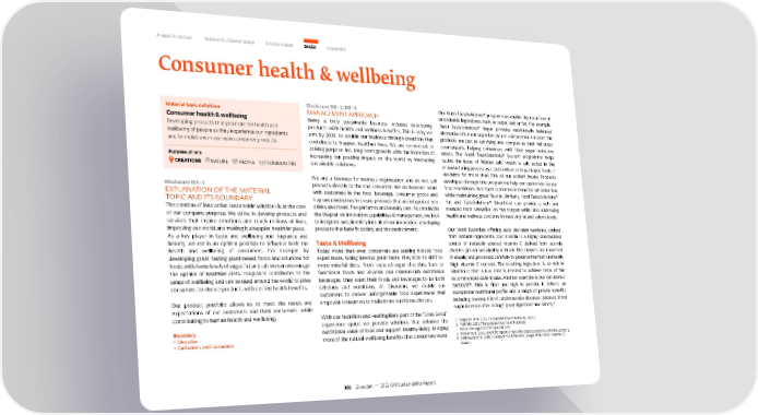 A year in review Economic / Governance Environment Social Appendix Consumer health & wellbeing Disclosure 103 – 2, 103 – 3 Our Nutri TasteSolutions® programmes enable the reduction of Material topic definition MANAGEMENT APPROACH undesirable ingredients such as sugar, salt or fat. For example, Consumer health & wellbeing Being a truly sustainable business includes developing Nutri TasteSolutions® Sugar provides nutritionally balanced Developing products that promote the health and products with health and wellness benefits. This is why we alternatives that cut sugar but do not compromise on taste: the wellbeing of people as they experience our ingredients aim, by 2030, to double our business through creations that products are just as satisfying and complex as their full-sugar and formulations in everyday consumer products. contribute to happier, healthier lives. We are committed to counterparts, helping consumers with their sugar reduction driving purpose-led, long-term growth with the intention of needs. The Nutri TasteSolutions® Sodium programme helps Purpose pillars increasing our positive impact on the world by innovating tackle the issue of ‘hidden salt,’ which is salt added in the CREATIONS NATURE PEOPLE COMMUNITIES sustainable solutions. manufacturing process as a taste enhancer to packaged foods: it accounts for more than 70% of our sodium intake. Products We are a business-to-business organisation and do not sell developed through this programme help our customers create Disclosure 103 – 1 products directly to the end consumer. We do however work food experiences that meet consumer demand for salt reduction EXPLANATION OF THE MATERIAL with customers in the food, beverage, consumer goods and while maintaining great flavour. Similarly, Nutri TasteSolutions® TOPIC AND ITS BOUNDARY fragrance industries to create products that are integrated into Fat and TasteSolutions® Mouthfeel can provide a rich and The creation of innovative, sustainable solutions is at the core drinks and meals, fine perfumes and laundry care. As detailed in rounded taste sensation on the tongue while also addressing of our company purpose. We strive to develop products and the chapter on Innovation capabilities & management, we look health and wellness concerns by reducing fat and calorie levels. services that inspire emotions and touch millions of lives, to integrate sustainability into all of our innovation, developing improving our world and making it a happier, healthier place. products that benefit society and the environment. Our Nutri Essentials offering adds desirable nutrients, derived As a key player in taste and wellbeing and fragrance and from natural ingredients. Our acerola is a highly standardised beauty, we are in an optimal position to influence both the Taste & Wellbeing source of naturally sourced vitamin C derived from acerola health and wellbeing of consumers. For example, by Today, more than ever, consumers are seeking holistic food cherries grown sustainably in Brazil. The cherries are harvested developing great tasting plant-based foods and solutions for experiences. Going beyond great taste, they look to shift to manually and processed carefully to preserve the fruit’s naturally foods with lower levels of sugar, fat and salt we can encourage more mindful diets. From reduced-sugar chocolate bars to high vitamin C content. The resulting ingredient is so rich in the uptake of healthier diets. Fragrance contributes to the functional foods and vitamin and mineral-rich nutritional vitamin C that a low dose is needed to achieve 100% of the sense of wellbeing and can be used around the world to drive beverages, they want their foods and beverages to be both recommended daily intake. Another example is our oat extract consumers to choose products with desired health benefits. delicious and nutritious. At Givaudan, we enable our SWEOAT®. Rich in fibre and high in protein, it delivers an customers to deliver unforgettable food experiences that exceptional nutritional profile and a range of proven benefits, Our product portfolio allows us to meet the needs and empower consumers to make more nutritious choices. including lowered risk of cardiovascular diseases ¹, reduced blood expectations of our customers and their consumers, while sugar increase after eating ², good digestion ³ and satiety ⁴. contributing to human health and wellbeing. With our Nutrition and Health pillars, part of the “Does Good” experience space, we provide solutions that enhance the 1. Ferguson et al, 2019, Clinical Nutrition, Volume 39, Issue 1. Boundary nutritional value of food and support healthy living, bringing 2. Tosh SM, 2013, The European Journal of Nutrition, • Givaudan https://doi.org/10.1038/ejcn.2013.25. • Customers and consumers more of the natural wellbeing benefits that consumers want. 3. Poeker et al, 2018, Scientific reports, https://doi.org/10.1038/s41598-018-22438-y. 4. Hlebowizc et al, 2008, Journal of the American C ollege of Nutrition, Volume 27, Issue 4. 101 Givaudan — 2021 GRI Sustainability Report