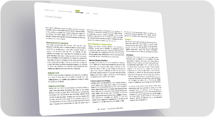 A year in review Economic / Governance Environment Social Appendix Climate change 0.87 CO₂e/employee per year. Givaudan actively encourages its The three most relevant insetting solutions for Givaudan are our scope 3 calculation models. Emissions related to transport continue to grow as Givaudan’s business grows. The decoupling employees to reduce the GHG emissions of their daily commute reforestation, improved plantations (for example, firewood of this activity is complex and requires important changes in by supporting a range of schemes including a bike-to-work plantation for distillation) and improved agricultural practices. the design of the entire supply chain. The COVID-19 pandemic initiative at our Swiss sites, the facilitation of carpooling through has also complicated transport activity in general, and this was our intranet platform, and the provision of recharge stations to Enablers not beneficial to our footprint. support the transition to electric cars at some sites. Our efforts to become climate positive also include a number of transversal enablers. They are not linked to a specific annual Waste generated in operations Neutralisation / compensation timeframe but are rather meant to support our climate journey This figure increased by 25% between 2015 and 2021. This Though our Climate Strategy prioritises the reduction of over the next 30 years. The approaches include innovation, increase is partially due to a reclassification of waste streams, emissions, we also look to neutralise or compensate residual supplier engagement, budget and financial mechanisms, which led to an increase of total GHG emissions related to emissions that cannot be reduced. Carbon removal solutions are advocacy and promotion as well as partnership and governance. waste of 6% between 2020 and 2021, for example. We also an essential element to going beyond net zero and achieving our identify an increase due to product mix evolution as well as climate positive target. The journey in front of us is long and the Innovation particular liquid discharges being separated from wastewater results will take time. This is why we are starting now. Ambitious GHG emission reduction is not possible without flows and being treated separately, accounting for waste in the innovation and an evolution of our technologies. We seek reporting. We have confidence in the future performance of Natural Climate Solutions opportunities to partner with experts from diverse fields in waste emissions in scope 3: our waste reduction strategy and Our approach is now focused on Natural Climate Solutions finding new ways to improve our environmental performance. scope 3 emissions reduction are perfectly aligned. We continue (NCS), which aim at the better management, protection and Givaudan invests substantially in R&D – it’s part of our DNA. to focus our attention on reducing waste production and restoration of ecosystems. They target a reduction of GHG For climate action in particular, we look at energy-intensive evaluating valorisation streams instead of disposal. emissions related to land use and changes in land use, the activities of our processes, for example, our cooling and capture and storage of additional CO₂ from the atmosphere refrigeration needs, and seek opportunities to use alternative Business travel and, finally, the improvement of ecosystem resilience, thereby technologies to achieve the same performance and jointly COVID-19 and associated travel bans and restrictions contributed helping communities adapt to the increases in flooding and reduce our GHG emissions. We have found that solar heat to a drop of more than 93% in business travel in 2021. The dry spells associated with climate change. offers an energy-efficient way to power industry’s needs for challenge here is to organise a post-pandemic strategy to travel cooling and refrigeration. The opportunity is about developing less and more efficiently. Carbon capture technology the technology that will be able to efficiently and reliably Insetting, that is, the neutralisation of our emissions through a respond to variable needs across a range of processes and sites. Employee commuting carbon capture and storage project within our value chain, is During 2021, we carried out an employee commuting survey to highly relevant for Givaudan because we have a direct footprint in As discussed in the section on low-carbon creations above, collect data and better understand the impact of our various natural supply chains located in countries where the environment biotechnology also holds potential for carving out a more initiatives in this category. With 7,000 employees participating, is under pressure. For us, insetting means natural solutions in the sustainable future for perfumery and for our planet. At we learned that our emissions are decreasing: without taking supply chains, with the producing communities. It is not the Givaudan, it has already led to some extraordinary innovations. COVID-19 and associated working-from-home measures into easiest approach because it involves land availability and long- Akigalawood®, a novel material that has a profile similar to account, we reduced our output of CO₂e/employee per year to term commitment, traceability and auditing. It is the most that of patchouli, is another example of a raw material now 1.15 tCO₂e from 2.0 tCO₂e in 2015. If we take working from home credible, relevant approach to Givaudan and in line with our SBTi produced through biotechnology and a groundbreaking, due to the pandemic situation into account, the figure drops to engagements. It will also benefit our communities socially. environmentally friendly process. 61 Givaudan — 2021 GRI Sustainability Report