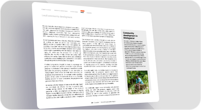 A year in review Economic / Governance Environment Social Appendix Local community development Western Australia’s local indigenous aboriginal communities, soap to encourage children to learn how to wash their hands who are considered high risk and more prone to health issues. through play. The team also worked with a digital agency to Community The team, supported by Australian Government’s COVID-19 create an online game, Challenge 20, teaching the key steps of Remote Indigenous Community Task Force, subsequently hand-washing routines. Players have 20 seconds to kill as many development in delivered nearly 250,000 sanitiser products during 2020 and ‘germs’ on the hands as possible to progress to the next level. Madagascar 2021, impacting the lives of thousands of community members. Our employees also contribute through our work with the Our work in Madagascar helps mitigate At our Cuernavaca and Mexico City sites, where the local teams Givaudan Foundation, a not-for-profit organisation that has our environmental impact and support are working on ‘single use plastics’ and ‘community care’ funded projects to help build more secure futures for community development. In the Analanjirofo agendas as part of a project with a local NGO partner, the communities and their environments since 2014. A full half of region, we help small-scale producers of recycling of more than four tons of their single use plastic waste the foundation’s projects are directly proposed and designed clove leaf oil establish sustainable sources in the form of bottle caps both helped Givaudan meet its global by employees who wish to make a change in communities of firewood and improve distillation waste target. A partnership with the Mexican NGO Banco de where Givaudan sources natural ingredients and communities equipment. This year, we planted more than Tapitas AC, which uses the proceeds from its bottle cap where our employees work. The foundation also works with 117,000 trees and continued developing collection and recycling to help children and young adults local organisations to identify and respond to local needs and and promoting environmentally friendly suffering from cancer, means that the efforts also contributed then carry out projects in three main areas: education, health, agricultural skills. In the vanilla supply chain, significantly towards building happier and healthier communities and preservation of the environment. The foundation works we built and equipped a new health centre through the provision of medical and food support. closely with and relies on resources provided by Givaudan to offering vanilla farmers from eight villages conduct and monitor its projects. Such initiatives encompass health care access. We also started A related programme, Imagin8, is meant to encourage our 27 ongoing projects in 12 countries, touching more than construction of a new school. Our people to explore their personal connection to the company 40,000 beneficiaries as well as their families and communities. efforts have had an impact on more than purpose. It contributes to the scale-up of our efforts in social 11,000 beneficiaries. innovation by prompting employees to see themselves as In certain supply chains, we develop targeted action plans in changemakers. With a focus on small, simple ideas that can cooperation with the producers, suppliers and/or other accelerate improvements in, for example, social conditions, organisations such as NGOs. This allows us to support projects positive climate action, mental health or access to affordable, in education and health as well as good practices in agriculture healthy products for more communities, the programme has and processing. We also assist in safeguarding the environment generated hundreds of ideas. and natural resources, and encourage investment in sustainable development and innovation. More information can be found In keeping with the mindset of ‘think small with a big impact,’ in the chapter on Responsible Sourcing & Traceability. one very simple but effective idea was to promote hand- washing among children. At the height of the COVID-19 We additionally support local communities with charitable pandemic in 2020, our employees saw the need to improve giving. We work with producers, suppliers and/or other hygiene among children in poorer countries. Colleagues in Brazil, organisations to bolster projects in education, health and Malaysia, Nigeria, Singapore, UK and the USA collaborated and nutrition as well as good practices in agriculture and by 2021 we were able to pilot a sustainable, colour-changing bar production. We help communities safeguard their environment 114 Givaudan — 2021 GRI Sustainability Report