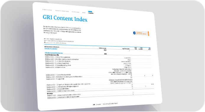 A year in review Economic / Governance Environment Social Appendix GRI Content Index For the Materiality Disclosures Service, GRI Services reviewed that the GRI content index is clearly presented and the references for Disclosures 102 – 40 to 102 – 49 align with appropriate sections in the body of the report. AR = 2021 Integrated Annual Report GCFR = 2021 Governance, Compensation and Financial Report www.givaudan.com ▸ Media ▸ Publications SASB UNGC SDG GRI Standard and Disclosure Publication year Page/Information Code Principles Goals GRI 101: Foundation 2016 1 GRI 102: General Disclosures 2016 Organizational profile Disclosure 102 – 1 Name of the organisation Givaudan SA Disclosure 102 – 2 Activities, brands, products, and services AR p 1 Disclosure 102 – 3 Location of headquarters Vernier, Switzerland Disclosure 102 – 4 Location of operations AR pp 152–159 Disclosure 102 – 5 Ownership and legal form GCFR pp 4, 5 Disclosure 102 – 6 Markets served AR pp 150, 151 Total number of sites: 185; Total number of employees: > 16,800 (FTE); Group sales: CHF 6.8 billion; Total assets: CHF 11.4 billion; Equity Disclosure 102 – 7 Scale of the organisation ratio: 34.5%; Products sold per year: > 126,460. Disclosure 102 – 8 Information on employees and other workers 88 6 8 Disclosure 102 – 9 Supply chain 108 We had no changes in the share capital structure and no significant changes in our supply chain Disclosure 102 – 10 Significant changes to the organisation and its supply chain in 2021. For new site openings see AR pp 8–9. Disclosure 102 – 11 Precautionary Principle or approach 33 12, 13 Disclosure 102 – 12 External initiatives 18 1 Disclosure 102 – 13 Membership of associations 22 Strategy Disclosure 102 – 14 Statement from senior decision-maker 4 Disclosure 102 – 15 Key impacts, risks and opportunities 6 120 Givaudan — 2021 GRI Sustainability Report