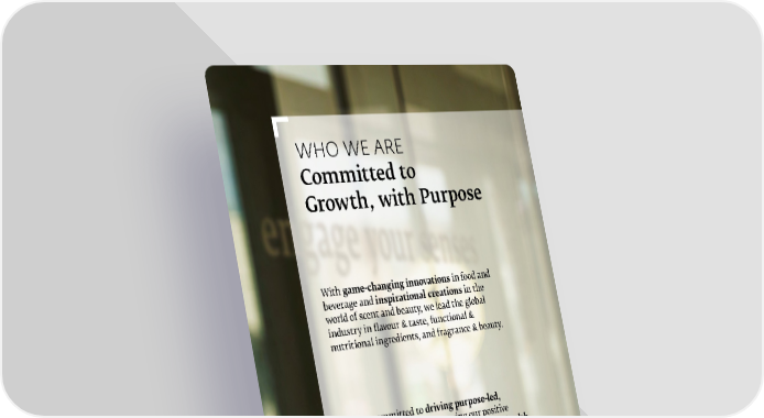 WHO WE ARE Committed to Growth, with Purpose With game-changing innovations in food and beverage and inspirational creations in the world of scent and beauty, we lead the global industry in flavour & taste, functional & nutritional ingredients, and fragrance & beauty. We are committed to driving purpose-led, long-term growth by increasing our positive impact on nature and improving people's health and happiness . It’s a commitment to create shared value for the business, society and nature.