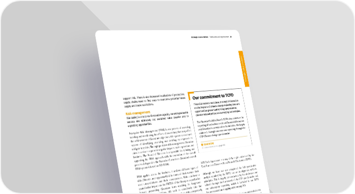 support this. There is also increased localisation of production; supply chains need to find ways to overcome potential future supply and trade restrictions. Risk management Risk taking is core to our innovation capacity, our entrepreneurial success and ultimately our sustained value creation and to exploiting opportunities. Enterprise Risk Management (ERM) is our process of assessing, treating and monitoring the effects of uncertainty that may affect the achievement of Givaudan’s objectives. We operate a structured system of identifying, assessing and deciding on responses to mitigate key risks. Through provident risk management, Givaudan aims to reduce or prevent negative impacts on its operations and business. The Board of Directors is responsible for defining and approving the ERM approach with the execution of the overall process delegated to the Executive Committee. Givaudan’s overall ERM system is based on ISO 31000. ERM applies across the business. It reviews different types of risks (threats and opportunities) in terms of their nature, their root causes/drivers and their consequences. Risks can have a quantitative impact on the EBITDA of the Group or a qualitative impact preventing Givaudan from reaching its long-term objectives and ambitions. We seek to consciously take the appropriate amount of risk, to manage these risks competently at the right level of the organisation, and to seize related business opportunities. We do conduct “zero-based” holistic risk refresh at the time of a new five-year strategy cycle. The last such holistic risk refresh was conducted in 2020 in connection with the 2025 strategy and the outcomes reported to the Board of Directors in early 2021. The Board of Directors reviews regularly whether the risks, especially the highest ones, are still pertinent. READ MORE For details on our enterprise risk management framework please consult: www.givaudan.com ▸ Our Company ▸ Corporate governance ▸ Risk management Increased priority for climate change risk As a business potentially affected by climate change, we have been carefully considering – with increasing scrutiny since the Our commitment to TCFD Financial markets need clear, thorough information on the impacts of climate change including risks and opportunities presented by rising temperatures, climate-related policies and emerging technologies. The Financial Stability Board’s TCFD aims to bolster the reporting of such climate-related financial information and Givaudan is committed to the initiative. We largely address it through our extensive reporting through the CDP Climate change questionnaire. READ MORE TCFD Recommendations ▸ page 163 2015 Paris Agreement – many of the topics addressed by the Task Force on Climate-related Financial Disclosures (TCFD). Although we have not yet completed the full quantitative analysis required by the TCFD, we are in alignment with its principles. This is largely demonstrated by the disclosures we submit through the framework of the CDP questionnaire and our subsequent reporting, which is included in our TCFD Recommendations mapping table on page 163. The TCFD will help us and others to focus on and evaluate our exposure to climate change, encouraging the disclosure of reliable information on climate-related risks and the showcasing of actions and opportunities. This in turn will serve to strengthen the stability of the financial system, contribute to a better understanding of climate risks and ease the financing of a transition to a more stable, sustainable economy. Defending against cyber pandemic The risk of cyber attacks has increased markedly, making information security a vital component for business resilience. Givaudan is addressing this risk through both technologies and behavioural measures. Givaudan fi 2021 Integrated Annual Report Strategic value creation Tr ends, risks and opportunities 29 Strategic value creation