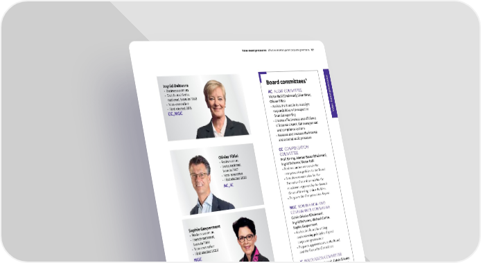 Value-based governance Sophie Gasperment • Businesswoman • French national, born in 1964 • Non-executive • Fir st elected 2020 NGC Ingrid Deltenre • Businesswoman • Dutch and Swiss national, born in 1960 • Non-executive • Firs t elected 2015 CC, N GC Olivier Filliol • Bu sinessman • Swiss national, born in 1967 • Non-executive • First elected 2020 AC, I C Board committees ¹ AC AUDIT COMMITTEE Victor Balli (Chairman), Lilian Biner, Olivier Filliol • Assists the Board in its oversight responsibilities with respect to financial reporting • Ensures effectiveness and efficiency of internal control, risk management and compliance systems • Assesses and oversees the internal and external audit processes CC COMPENSATION C OMMITTEE Prof. Dr-Ing. Werner Bauer (Chairman), Ingrid Deltenre, Victor Balli • Reviews and recommends the compensation policies to the Board • Sets the remuneration for the Executive Committee within the maximum approved by the Annual General Meeting of shareholders • Prepares the Compensation Report NGC NOMINATION AND G OVERNANCE COMMITTEE Calvin Grieder (Chairman), Ingrid Deltenre, Michael Carlos, Sophie Gasperment • Assists the Board in setting and reviewing principles of good corporate governance • Prepares appointments to the Board and the Executive Committee IC INNOVATION COMMITTEE Michael Carlos (Chairman), Calvin Grieder, Prof. Dr-Ing. Werner Bauer, Olivier Filliol • Assists the Board in scientific matters relating to the flavours, fragrances and cosmetics Industry • Identifies opportunities, proposes and screens potential innovation partner 1. All committee members were part of their respective committee(s) for the entire year of 20 21. The Board regularly reviews the list of competencies and has established a long-term skill matrix for the assessment of existing and required competencies, which is used as a basis for Board succession planning. Givaudan – 2021 Integrated Annual Report Value-based governance Eff ective and transparent corporate governance 127