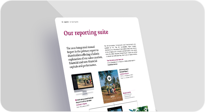 Our reporting suite The 2021 Integrated Annual Report is the primary report to shareholders offering a holistic explanation of our value creation, financial and non-financial capitals and performance. 2021 Integrated Annual Report Online version Available in English from 28 January 2022 2021 In a Nutshell Available in English, French and German PDF in English from 28 January 2022 Print and language versions from 24 March 2022 2021 Integrated Annual Report Available in English PDF from 28 January 2022 Print from 24 March 2022 2021 Governance, Compensation and Financial Report Available in English PDF from 28 January 2022 2021 GRI Sustainability Report Available in English PDF from 28 January 2022 READ MORE ▸ GRI Content Index ▸ SASB Standards ▸ TCFD Recommendations The full Governance, Compensation and Financial reports are available in PDF. The GRI Sustainability Report features disclosures on a wide range of topics such as energy use, diversity in the workplace, anti-corruption and human rights. Our website hosts the online Integrated Annual Report. Readers are advised to consult our entire reporting suite to get a complete overview. The full suite can be found on: www.givaudan.com ▸ Investors ▸ Online annual report ▸ Download centre Givaudan – 2021 Integrated Annual Report 172 Appendix Ou r reporting suite