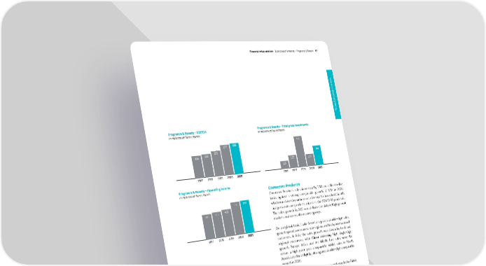Consumer Products Consumer Products sales increased by 1.5% on a like-for-like basis against a strong comparable growth of 9.1% in 2020, which was driven by an increased demand for household, health and personal care products related to the COVID-19 pandemic. The sales growth in 2021 was delivered mainly in high growth markets and across all customer groups. On a regional basis, Latin America reported double-digit sales growth spread across most sub-regions and led by international customers. In Asia, the sales growth was driven by local and regional customers, with China delivering high single-digit growth. Europe, Africa and the Middle East sales were flat versus a high prior year comparable, whilst sales in North America declined slightly, also against double-digit comparable growth in 2020. On a product segment basis, the sales growth was led by Fabric Care followed by Personal Care. Fragrance Ingredients and Active Beauty Sales of Fragrance Ingredients and Active Beauty increased by 14.2% on a like-for-like basis. Active Beauty saw a very strong rebound in 2021 and reported strong double-digit growth in both high growth and mature markets, most notably driven by the strong double-digit performance of the premium active ingredients. Fragrance Ingredients delivered a strong single-digit growth in 2021. Fragrance & Beauty – EBITDA in millions of Swiss francs Fragrance & Beauty – Operating income in millions of Swiss francs 2021 2020 2019 2018 2017 2021 2020 2019 2018 2017 Fragrance & Beauty – Total gross investments in millions of Swiss francs 2021 2020 2019 2018 2017 Fine Fragrances Fine Fragrances sales increased by 22.5% on a like-for-like basis compared with a decline of 6.0% in the previous year. After the significant negative impact of the COVID-19 pandemic in 2020, sales rebounded across all regions and customer groups driven by the high performance of existing business and by a significant level of new wins. All regions delivered strong sales performance with both mature and high growth markets delivering double-digit sales growth. The Western Europe and Middle East regions had the most significant results with both recording strong double-digit sales growth. All customer groups contributed to the excellent results, with local and regional, as well as customers of prestige brands recording double-digit growth. Givaudan – 2021 Integrated Annual Report Financial value creation Bu siness performance – Fragrance & Beauty 47 Financial value cration