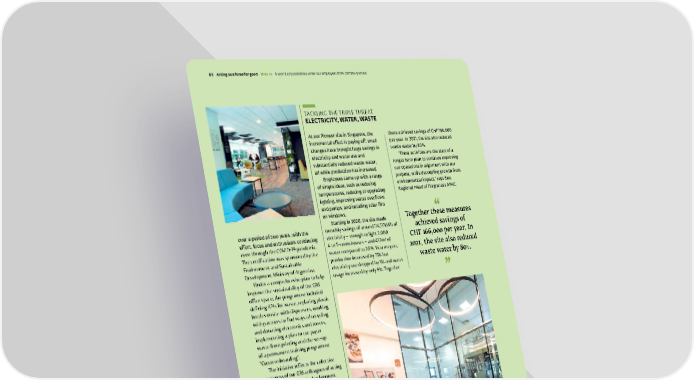 TACKLING THE TRIPLE THREAT ELECTRICITY, WATER, WASTE At our Pioneer site in Singapore, the incremental effect is paying off: small changes have brought large savings in electricity and water use and substantially reduced waste water, all while production has increased. Employees came up with a range of simple ideas, such as reducing temperatures, reducing or upgrading lighting, improving water overflows and pumps, and installing solar film on windows. Starting in 2020, the site made monthly savings of around 114,131kWh of electricity – enough to light 2,000 4 to 5-room houses – and 432m³ of water compared to 2019. Year on year, production increased by 15% but electricity use dropped by 3% and water usage increased by only 9%. Together Together these measures achieved savings of CHF 1 66,000 per year. In 2021, the site also reduced waste water by 80 % . over a period of two years, with the effort, focus and enthusiasm continuing even through the COVID-19 pandemic. The certification was sponsored by the Environment and Sustainable Development Ministry of Argentina. Under a comprehensive plan to help improve the sustainability of the GBS office space, the programme included defining KPIs for waste, replacing plastic bottles onsite with dispensers, working with partners to find ways of recycling and donating electronics and toners, implementing a plan to cut paper waste from printing and the set-up of a permanent training programme “Green onboarding”. The initiative reflects the collective awareness of our GBS colleagues of acting together for sustainable development. An e xample of living our purpose and engaging in collective action for a sustainable impact on people and nature. these achieved savings of CHF 166,000 per year. In 2021, the site also reduced waste water by 80%. "These activities are the start of a longer term plan to continue improving our operations in alignment with our purpose, while decoupling growth from environmental impact," says Ben, Regional Head of Fragrances APAC. Givaudan – 2021 Integrated Annual Report 80 Acting as a force for good Nat ure A wo rld of possibilities when our employees think climate-positive