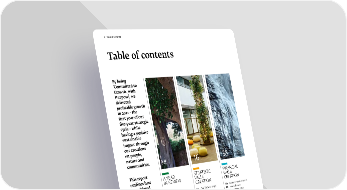 Table of contents A Y EAR IN REVIEW 6 Our impact in 2021 8 High lights 2021 10 Ch airman's letter 12 CE O interview STRATEGIC VALUE CREATION 18 Our 2025 strategy 26 Busin ess model 28 Tr ends, risks and opportunities 32 S takeholder engagement and materiality FINANCIAL VALUE CREATION 40 Business performance 4 8 A su s tainable investment case 4 38 16 By being ‘Committed to Growth, with Purpose’, we delivered profitable growth in 2021 – the first year of our five-year strategic cycle – while having a positive sustainable impact through our creations on people, nature and communities. This report outlines how we achieved growth and made positive impacts during the year. Givaudan – 2021 Integrated Annual Report 2 Table of contents