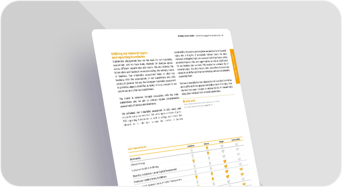 Creations Nature People Communities Biodiversity Climate Change Consumer Health & Wellbeing Diversity, Inclusion & Human Capital Development Employee Health & Safety & Wellness Governance & Business Conduct / ethic / transparency Human Rights Innovation Capabilities & Management Local Community Development Product / Ingredient Environmental & Social Performance Product Quality & Safety and Ingredient Disclosure Raw Materials Availability Responsible Sourcing & Traceability Waste Management & Circular Principles Water Stewardship Defining our material topics and reporting boundaries Stakeholder engagement lays out the basis for our materiality assessment, and we have many channels for dialogue spread across different departments and teams; this also includes the information and feedback we receive during the ordinary course of business. Our materiality assessment helps to align our business with the expectations of our stakeholders and with society in general. We use the Givaudan materiality assessment to prioritise aspects identified as being of most concern to our customers and other key stakeholders. The matrix is reviewed through discussions with the main stakeholders and we aim to conduct regular comprehensive assessments of surveys and interviews. We refreshed our materiality assessment in 2021 using desk research and proxy exercises. We drew upon a review of peers, ESG reporting frameworks as well as ratings and trends that allowed us to take into account the context of broader 2021 materiality list Even though purely financial issues have been excluded in our materiality update, we still report on the topic "Economic performance", which we consider fundamental to our social licence to operate and to our efforts to be a good corporate citizen, by using GRI 201: Economic Performance. sustainability discussions and lengthen our previous list of material topics into a long-list of potentially relevant topics. We then clustered overlapping topics and assessed their importance, taking potential impacts, risks and opportunities as well as significance for our business into account. This resulted in a reduced list of material topics. The short-listed topics were then discussed and ranked in detail through internal workshops with our Sustainability Leadership Team. The new materiality list was validated by our Executive Committee and is reflected in our updated materiality matrix of 15 topics. Over the next two years, we plan to validate the list of material topics using direct feedback from external stakeholders. READ MORE On the detailed elaboration of our materiality assessment 2021 GRI Sustainability Report ▸ pages 14–17 Givaudan – 2021 Integrated Annual Report Strategic value creation St akeholder engagement and materiality 37 Strategic value creation