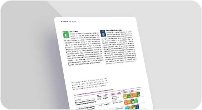 Life on land Givaudan is committed to sourcing all materials and services in a way that protects people and the environment by 2030. As an industry leader with 250 years of heritage, we work in partnership with producers and suppliers to transform the way we source and create new value to be shared by all as part of our Sourcing4Good programme. We recognise that we have an important obligation to contribute to preserving the environment and the planet’s biodiversity for future generations. Through our Responsible Sourcing Policy we request that suppliers shall comply with all applicable environmental regulations and always aim to reduce their impacts on nature and landscapes. Suppliers must implement environmental management principles which avoid any pollution of air, soils and water and, in parallel, conserve biodiversity and nurture biodiversity. How our key initiatives 2021 positively impact on sustainable development Focus Story Page reference IMPACTS Purpose Stakeholders benefited Our contribution to the SDGs Food experiences: From product economy to experience economy 62–63 Creations Customers, innovators and partners The Givaudan way: Designing nature-conscious fragrances that delight consumers 66–69 Creations Customers, suppliers A world of possibilities when our employees 'think climate positive' 78–80 Nature Local communities Cr eating a community with purpose 91– 9 4 People Employees Excelling in health and safety everywhere, every day 99 People Employees Supporting local communities with the Givaudan Foundation 107–109 Communities Local communities At the forefront of animal- free testing 110–111 Public & regulatory agencies, customers Partnerships for the goals Collaboration is essential in delivering on our bold ambitions. The more we do together, the quicker we drive sustainable solutions and the faster we meet our targets. Our collaborations with an ecosystem of partners; from UN Global Compact, to the World Business Council for Sustainable Development, to RE100 and The Earthworm Foundation, help to inform and support our work on our most material sustainability issues. We have strategic relationships with suppliers, start-ups and partners allowing for even greater collaboration and co-creation to develop innovative solutions for the future. Examples of this include our Connect to Win programme for supplier enabled innovation, our strategic collaboration to increase opportunities in biotechnology and our co-creation partnerships with many of the prominent players in plant-based proteins that caters to the strong shift towards plant-based meat alternatives and alternative protein sources. The following table gives an overview of our focus stories presented throughout this report, and indicates the main purpose pillar impacted, the priority stakeholders benefited and which Sustainable Development Goals are most supported. Givaudan – 2021 Integrated Annual Report 168 Appendix Ab out this report