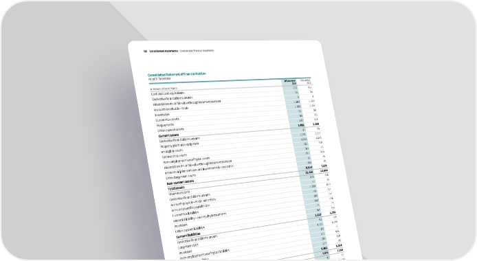 Consolidated Statement of Financial Position As at 31 December in millions of Swiss francs 31 December 2021 31 December 2020 Cash and cash equivalents 273 411 Derivative financial instruments 16 54 Financial assets at fair value through income statement 4 4 Accounts receivable - trade 1,464 1,359 Inventories 1,380 1,201 Current tax assets 57 66 Prepayments 65 50 Other current assets 147 154 Current assets 3,406 3,299 Derivative financial instruments 37 65 Property, plant and equipment 2,291 2,222 Intangible assets 4,853 4,543 Deferred tax assets 182 218 Post-employment benefit plan assets 69 20 Financial assets at fair value through income statement 297 180 Interests in joint ventures and investments in associates 37 35 Other long-term assets 248 76 Non-current assets 8,014 7, 3 5 9 Total assets 11,420 10,658 Short-term debt 428 206 Derivative financial instruments 37 49 Accounts payable - trade and others 1,008 809 Accrued payroll & payroll taxes 235 211 Current tax liabilities 188 157 Financial liability - own equity instruments 148 108 Provisions 13 23 Other current liabilities 261 233 Current liabilities 2,318 1,796 Derivative financial instruments 61 103 Long-term debt 4,239 4,245 Provisions 83 71 Post-employment benefit plan liabilities 371 545 Deferred tax liabilities 280 310 Other non-current liabilities 127 80 Non-current liabilities 5,161 5,354 Total liabilities 7, 4 7 9 7, 1 5 0 Share capital 92 92 Retained earnings and reserves 6,365 6,133 Own equity instruments (211) (168) Other components of equity (2,317) (2,567) Equity attributable to equity holders of the parent 3,929 3,490 Non-controlling interests 12 18 Total equity 3,941 3,508 Total liabilities and equity 11,420 10,658 Givaudan 6 2021 Integrated Annual Report 138 Consolidated statements Co nsolidated financial statements